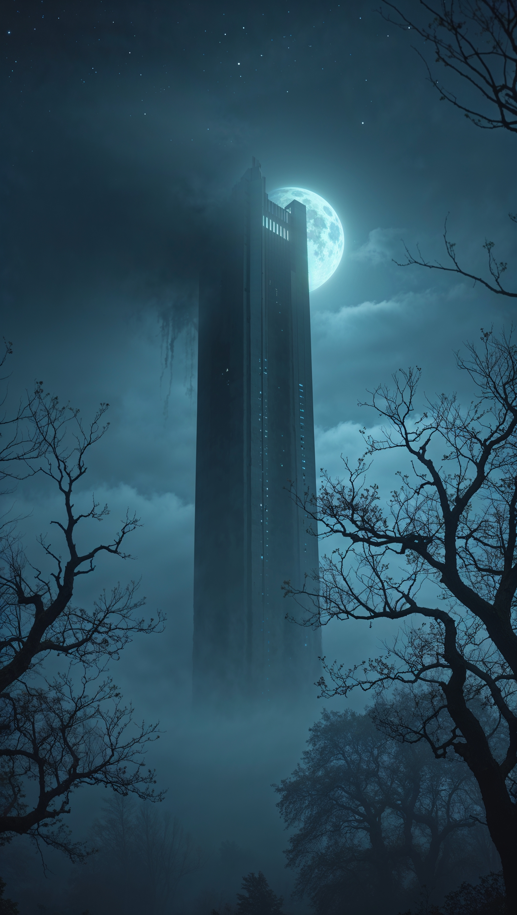 1664x2944 iPhone wallpaper with blue fog and scary tree shadows