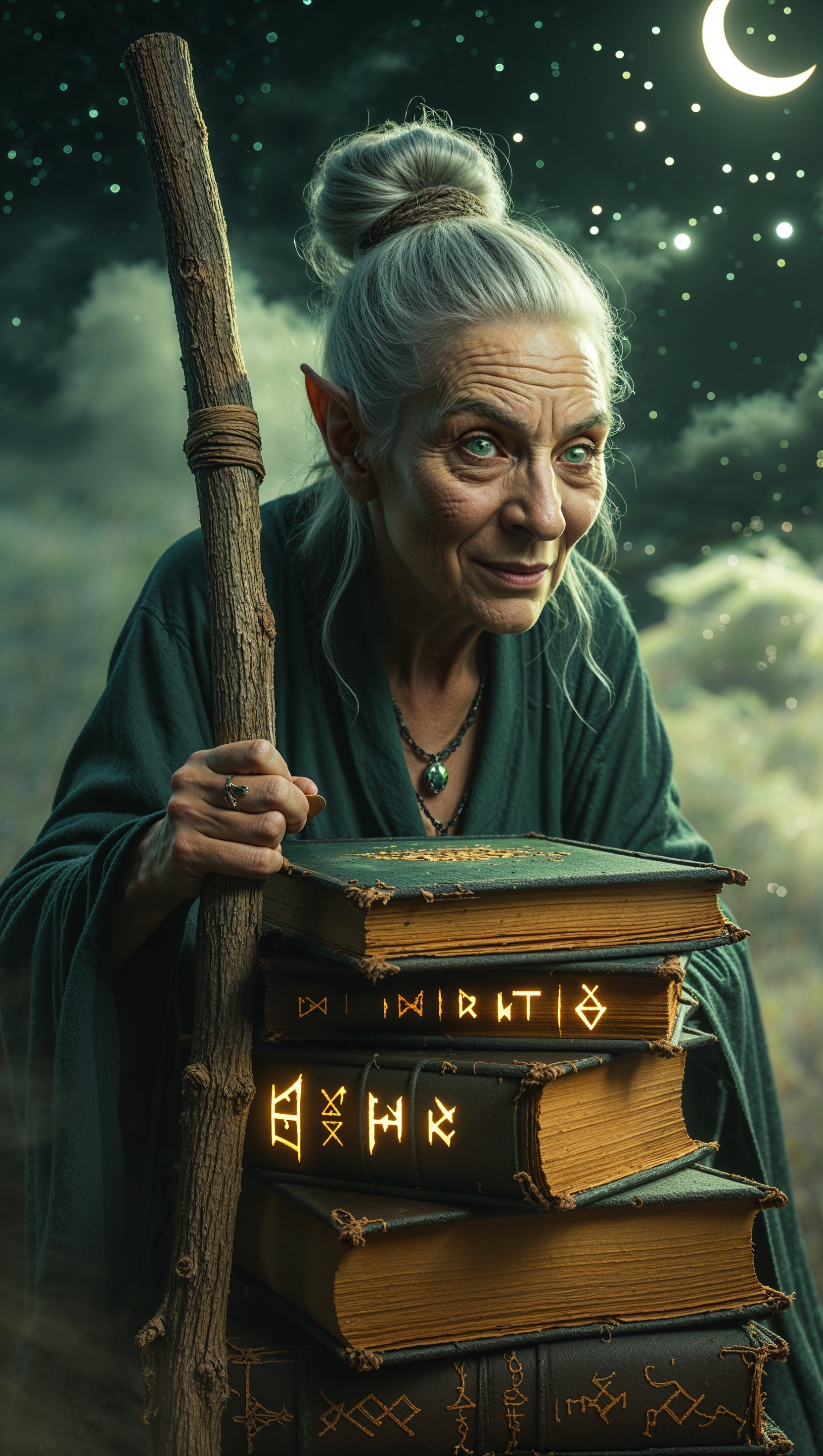1664x2944 iPhone wallpaper with old witch next to magic books