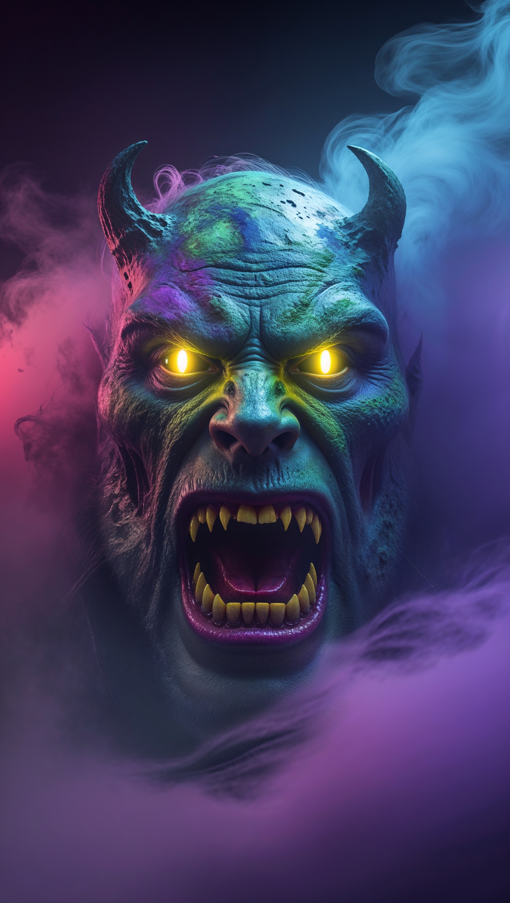 1664x2944 iPhone wallpaper with monster face in dark colorful fog