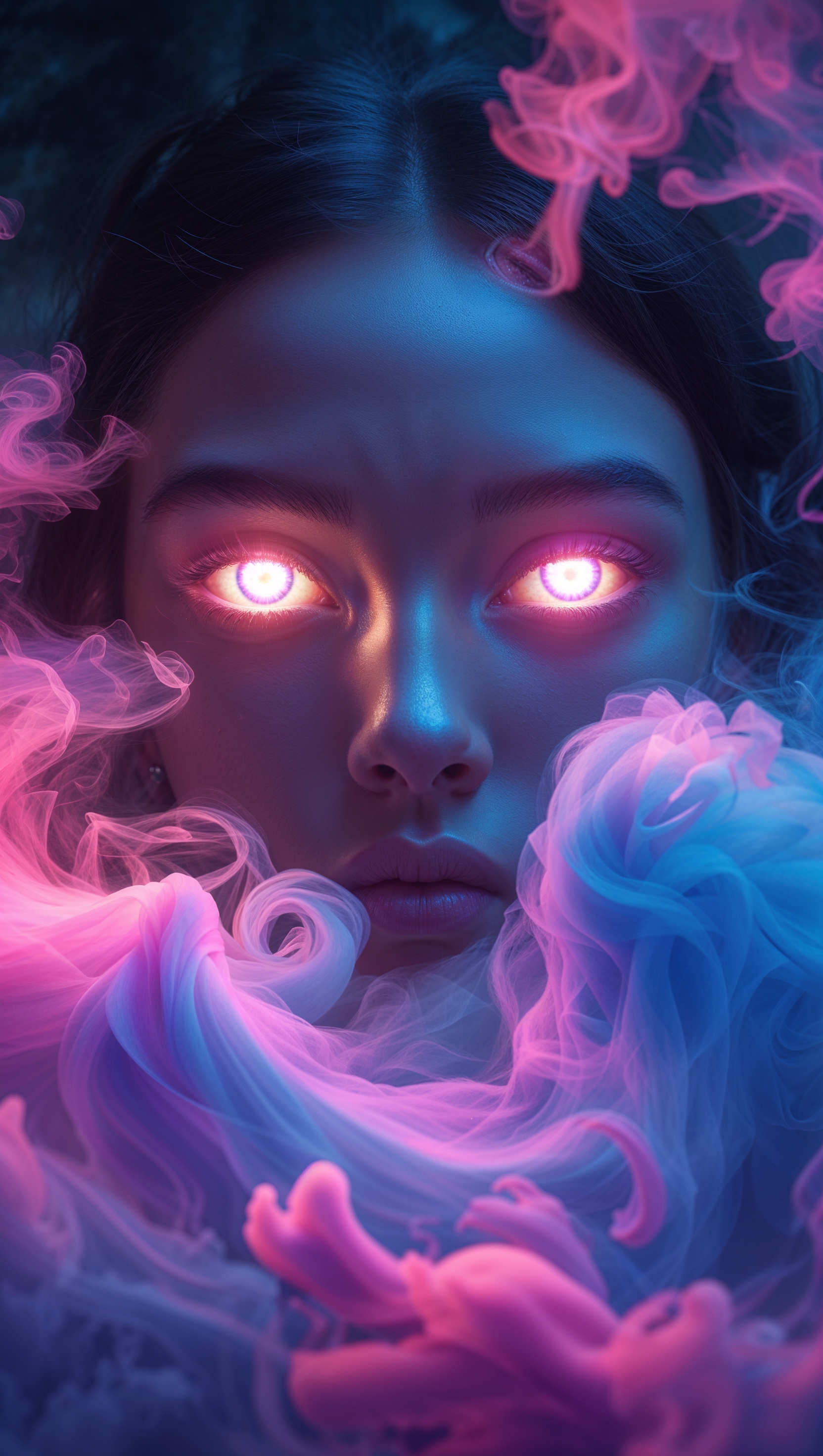 1664x2944 iPhone wallpaper with colorful fog and glowing eyes in dark