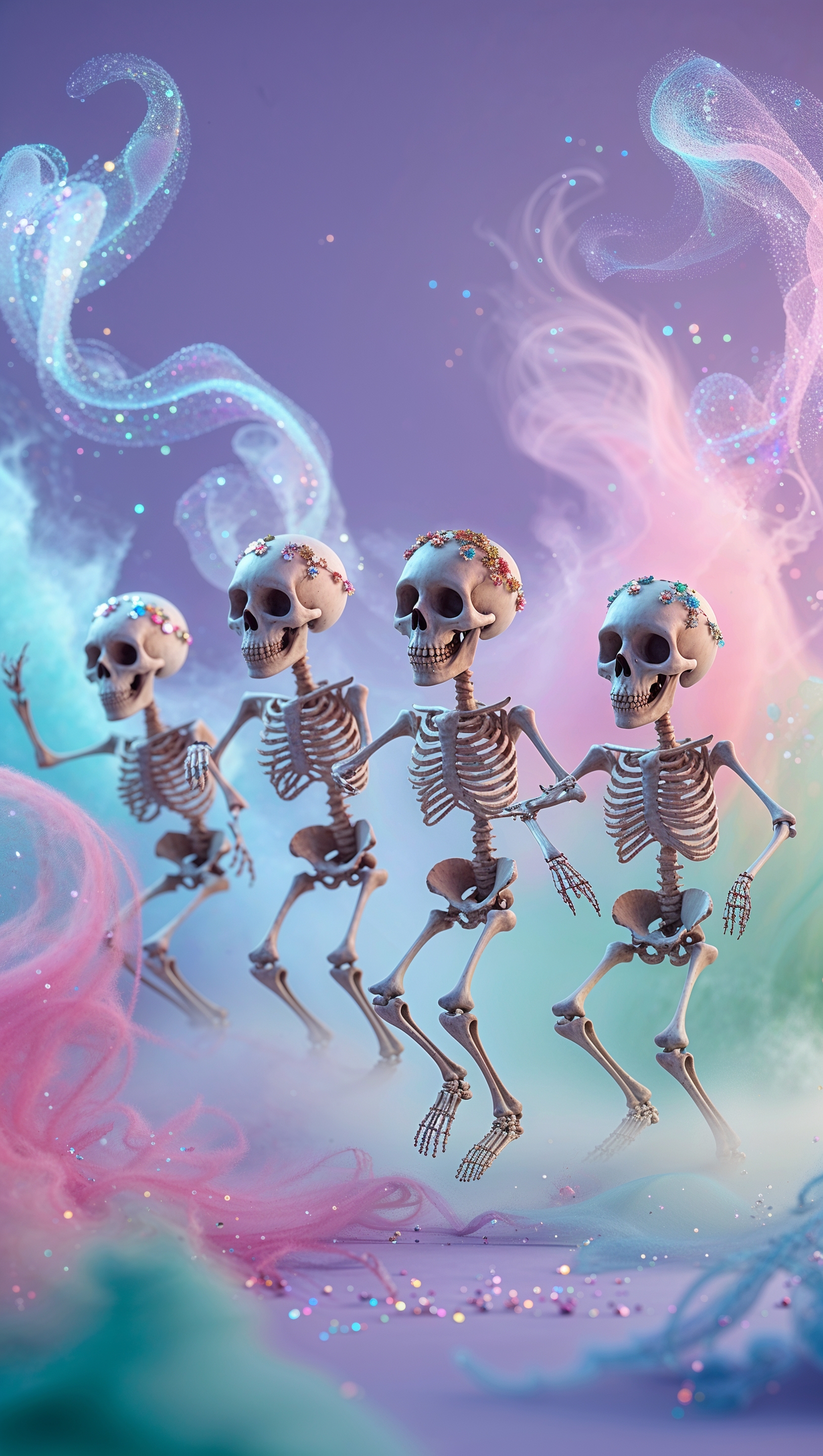 1664x2944 iPhone wallpaper with dancing skeletons in colorful mist
