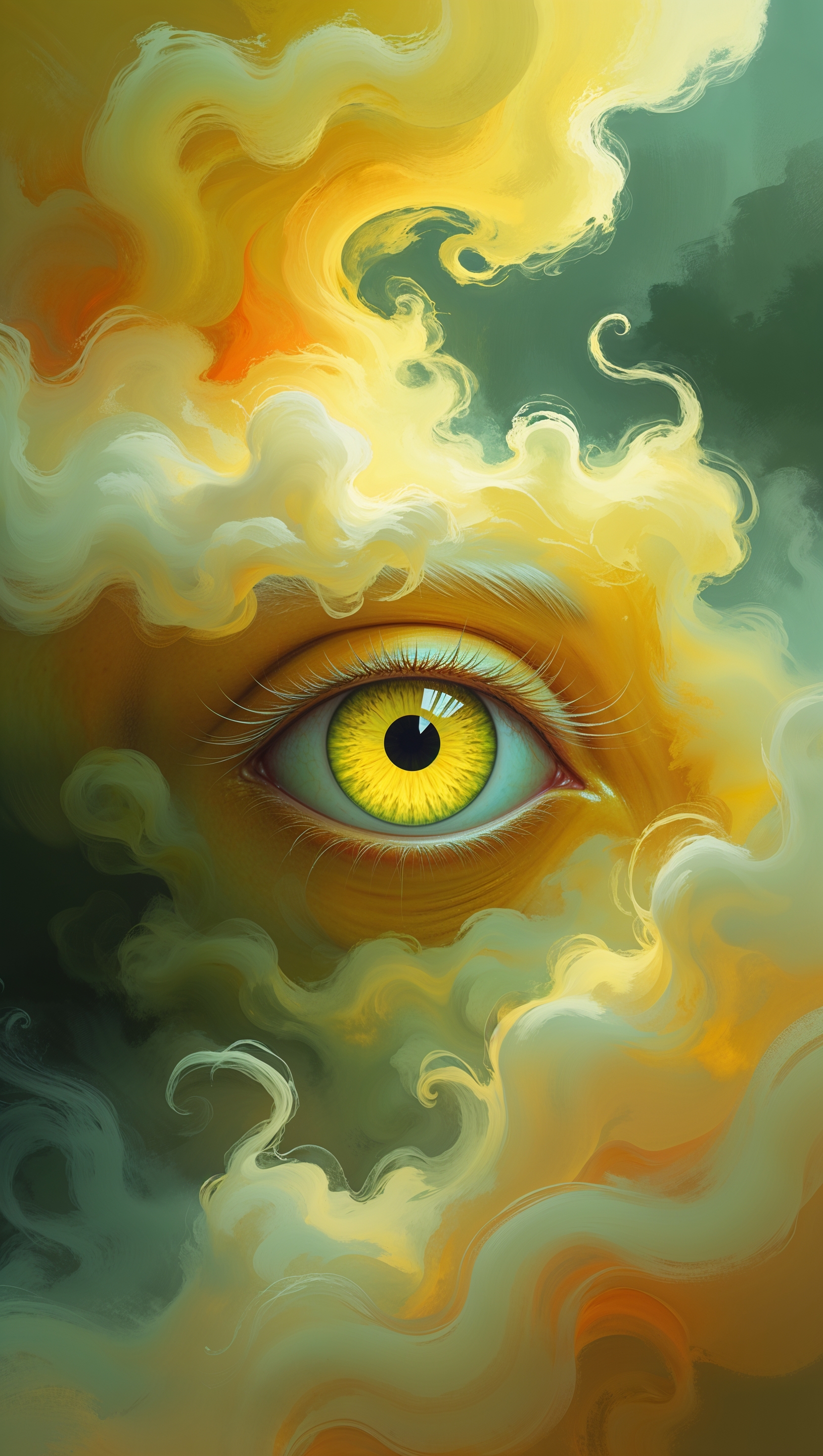 1664x2944 iPhone wallpaper with digital painting of scary eye and yellow fog
