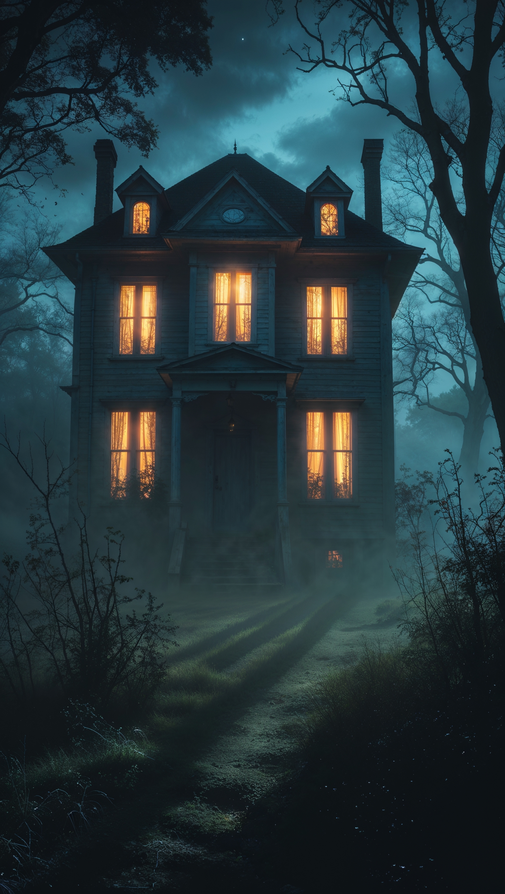 1664x2944 iPhone wallpaper with house having glowing windows and scary shadows