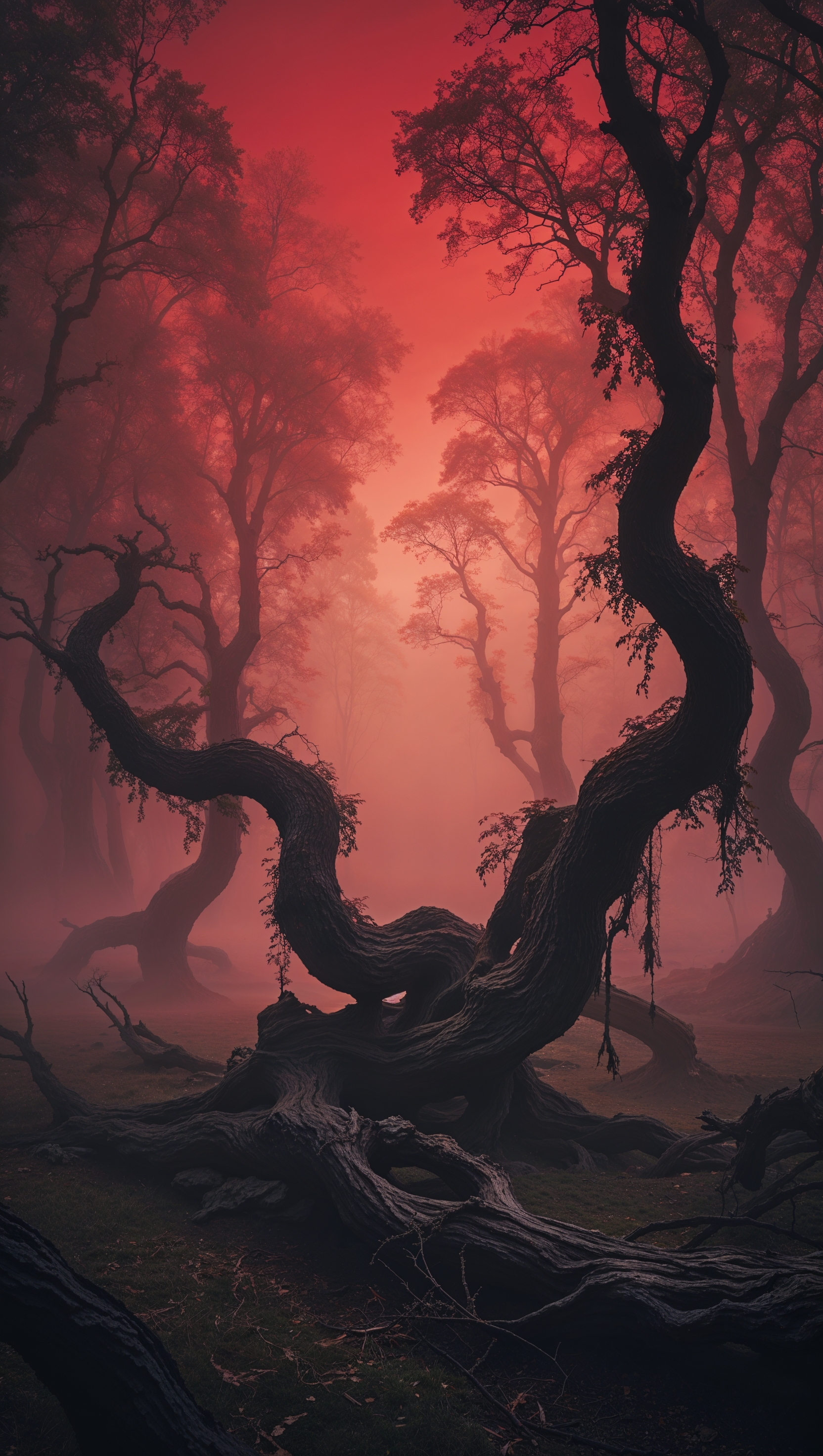 1664x2944 iPhone wallpaper with red fog and twisted dark trees