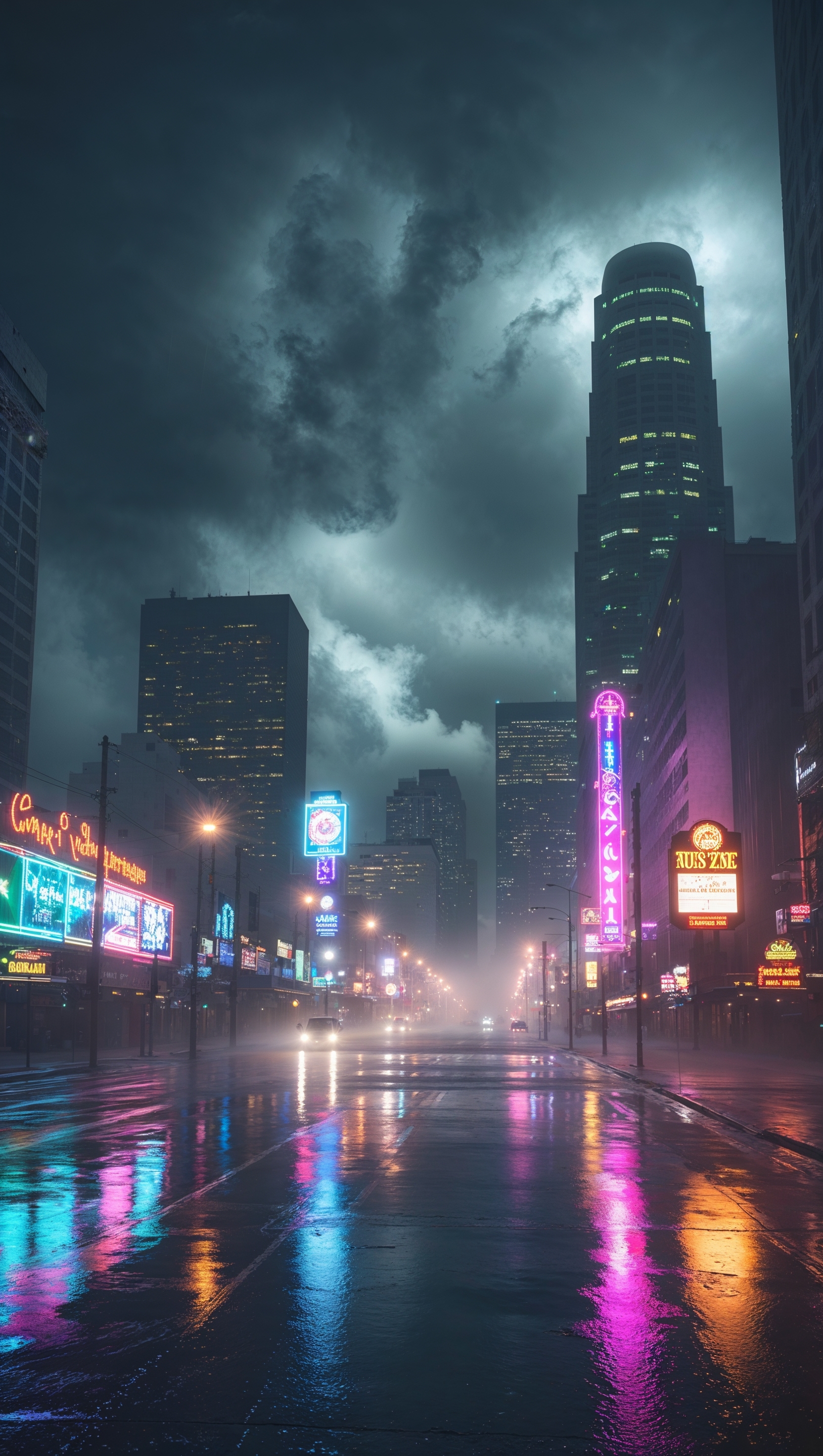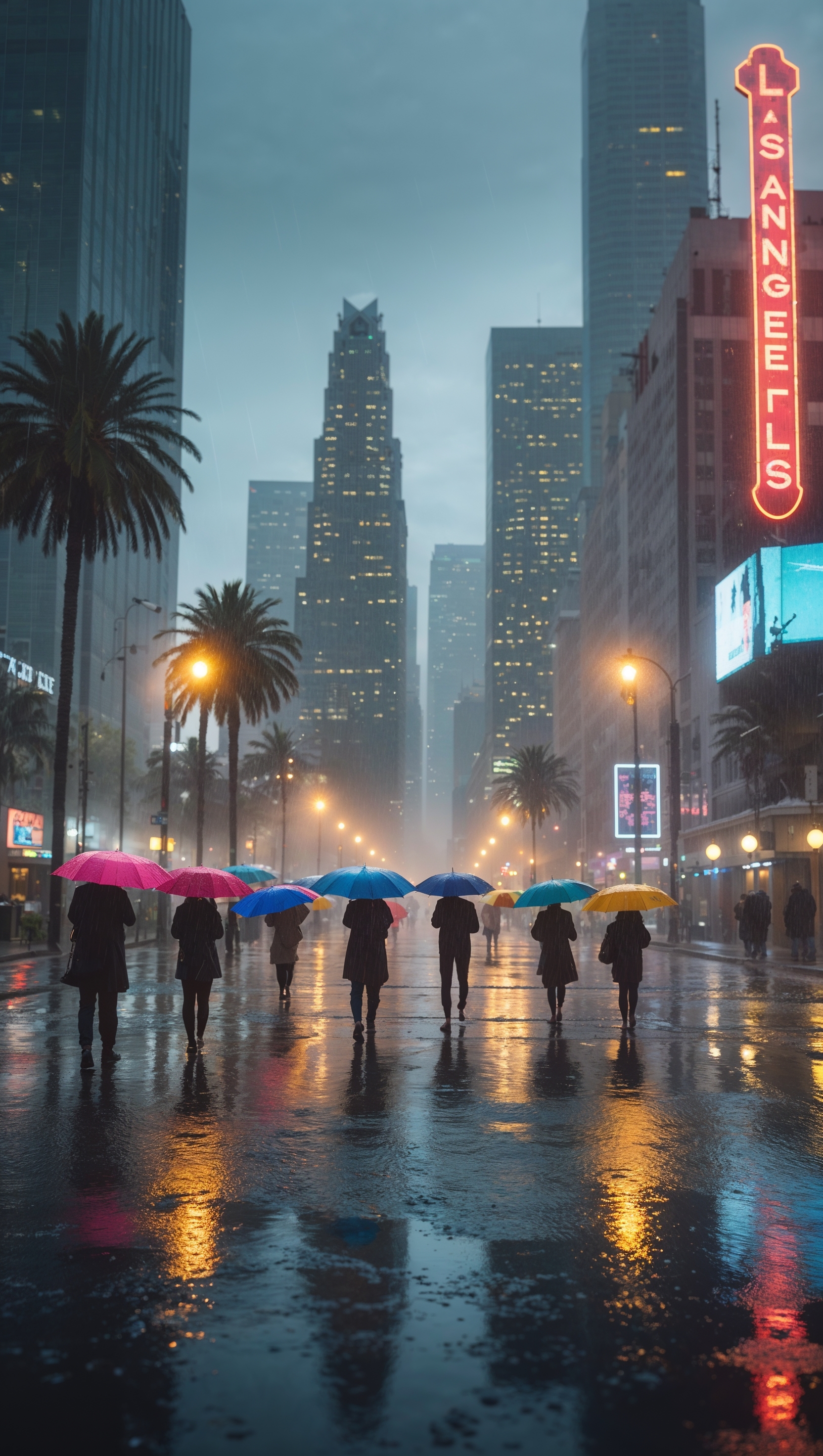1664x2944 Rainy night in Los Angeles with neon lights
