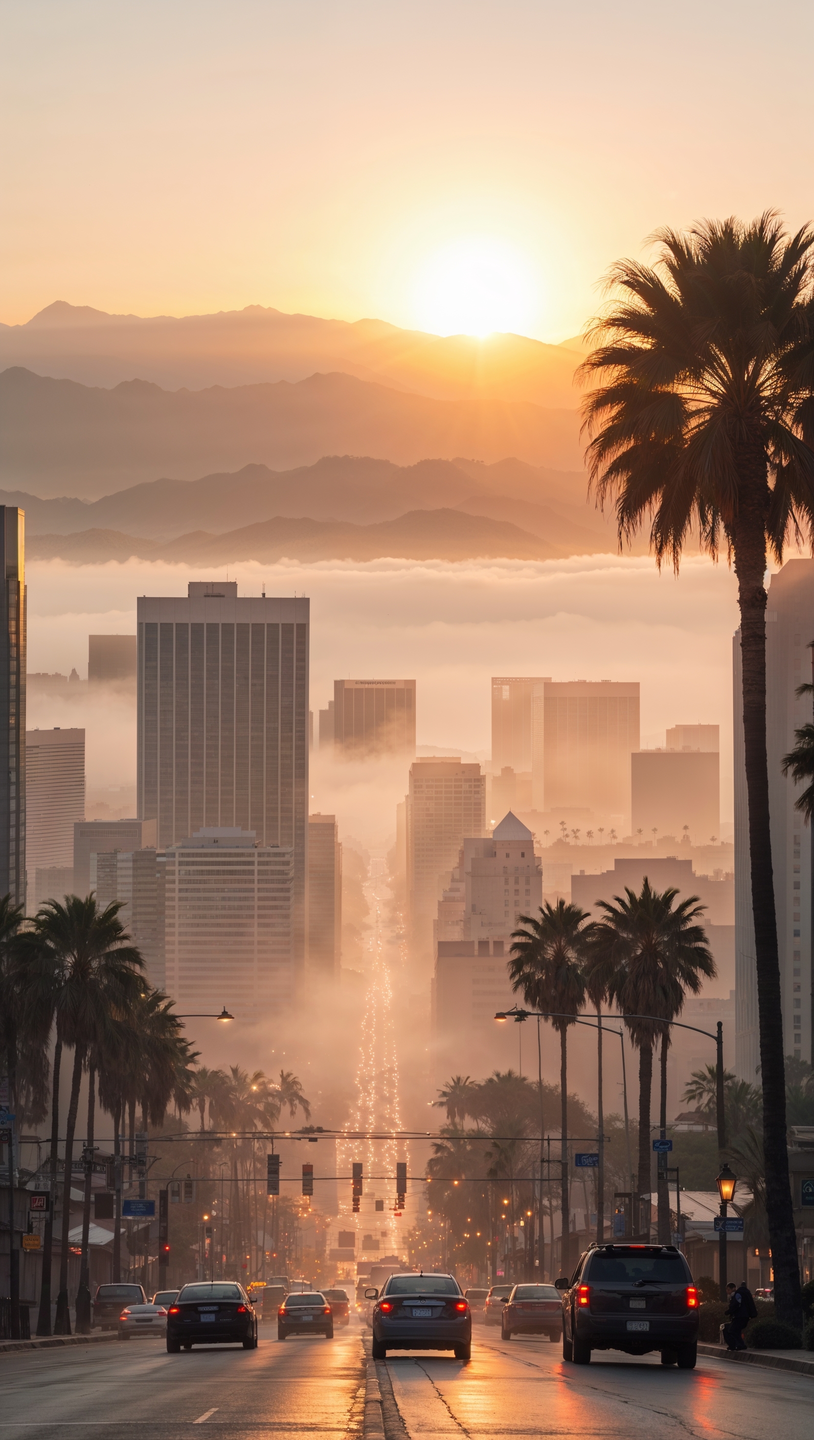 1664x2944 Los Angeles at sunrise with light fog