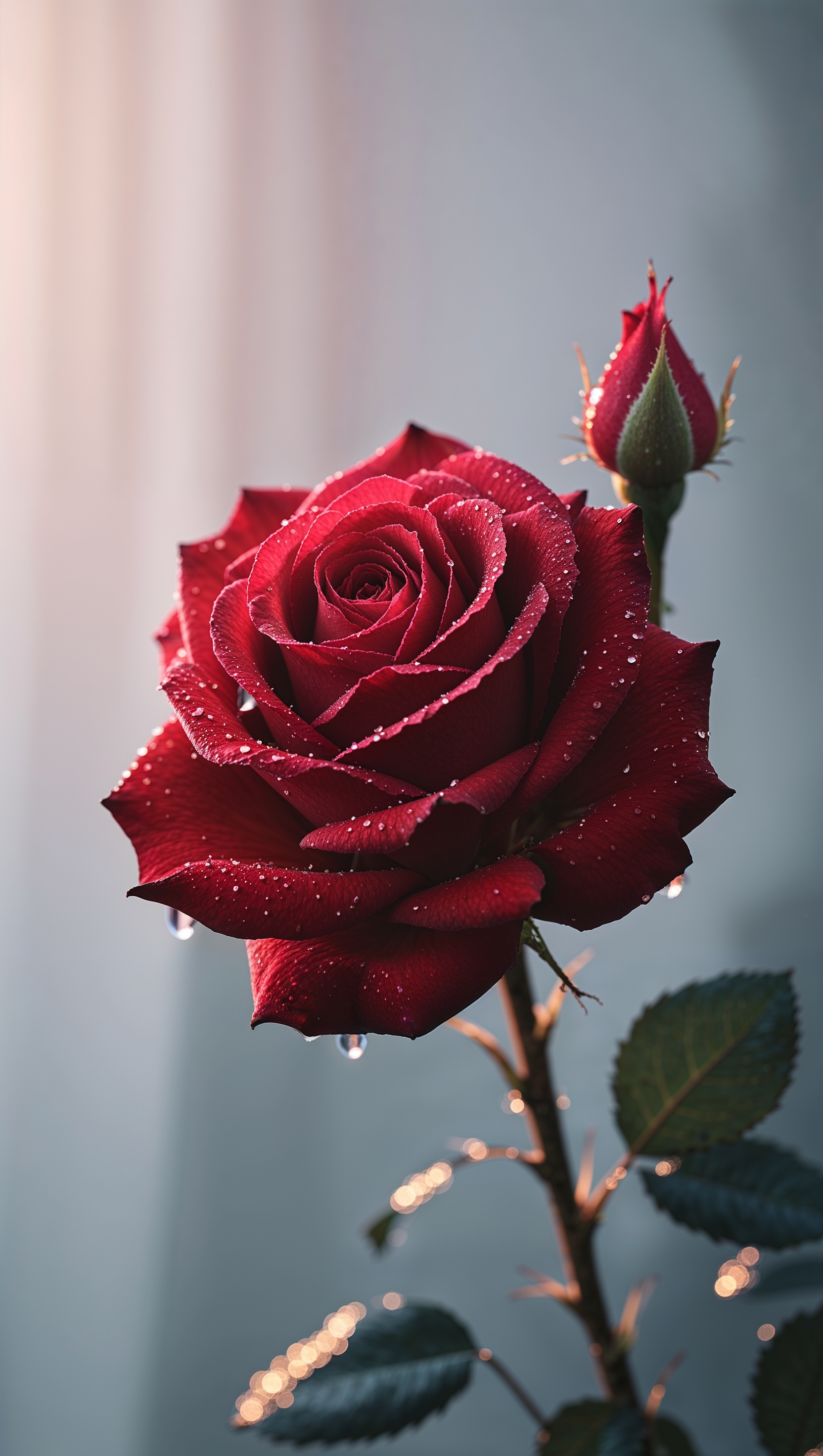 1664x2944 iPhone wallpaper with a red rose in soft morning light