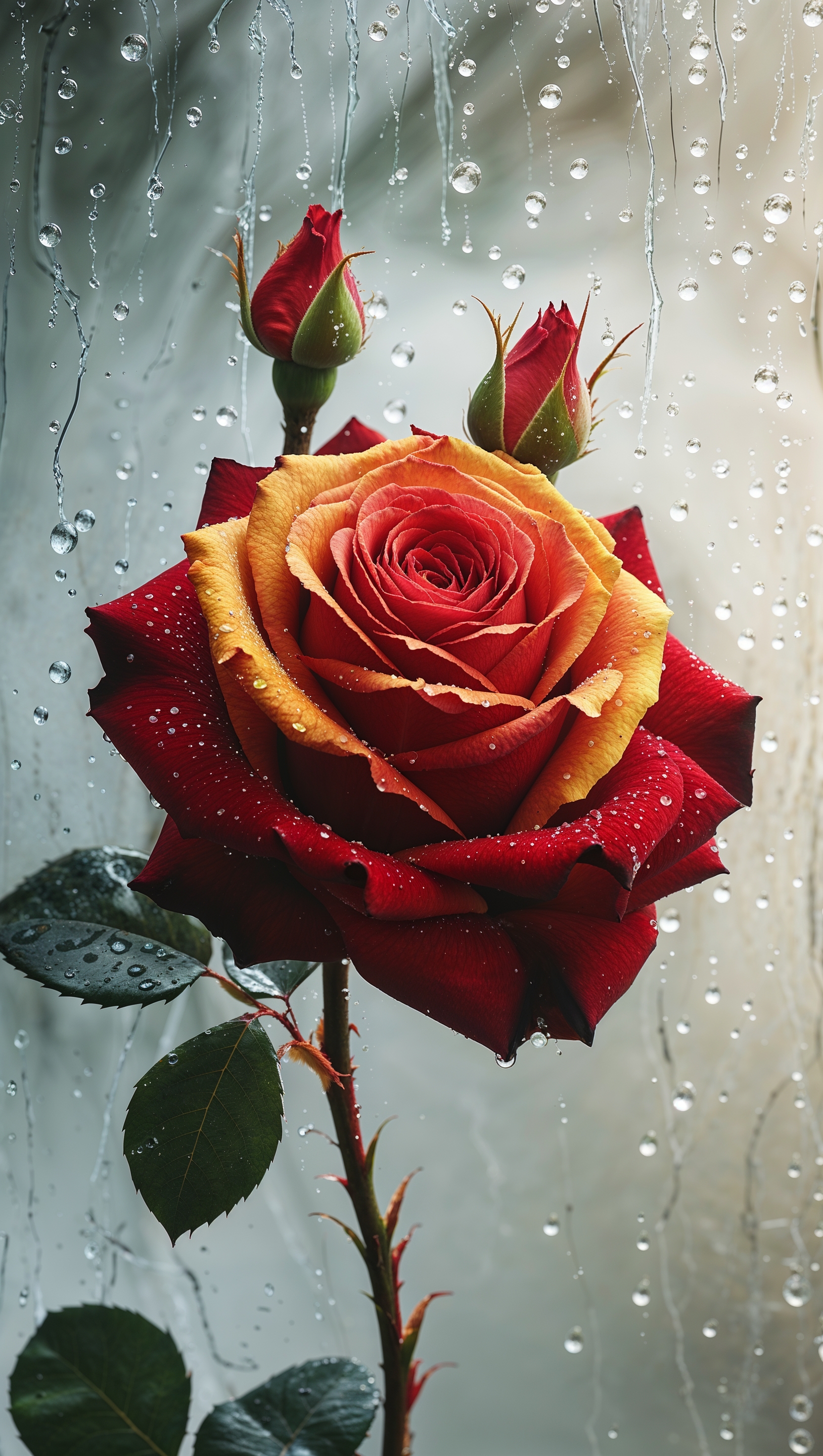 1664x2944 iPhone wallpaper with a red rose and rain drops