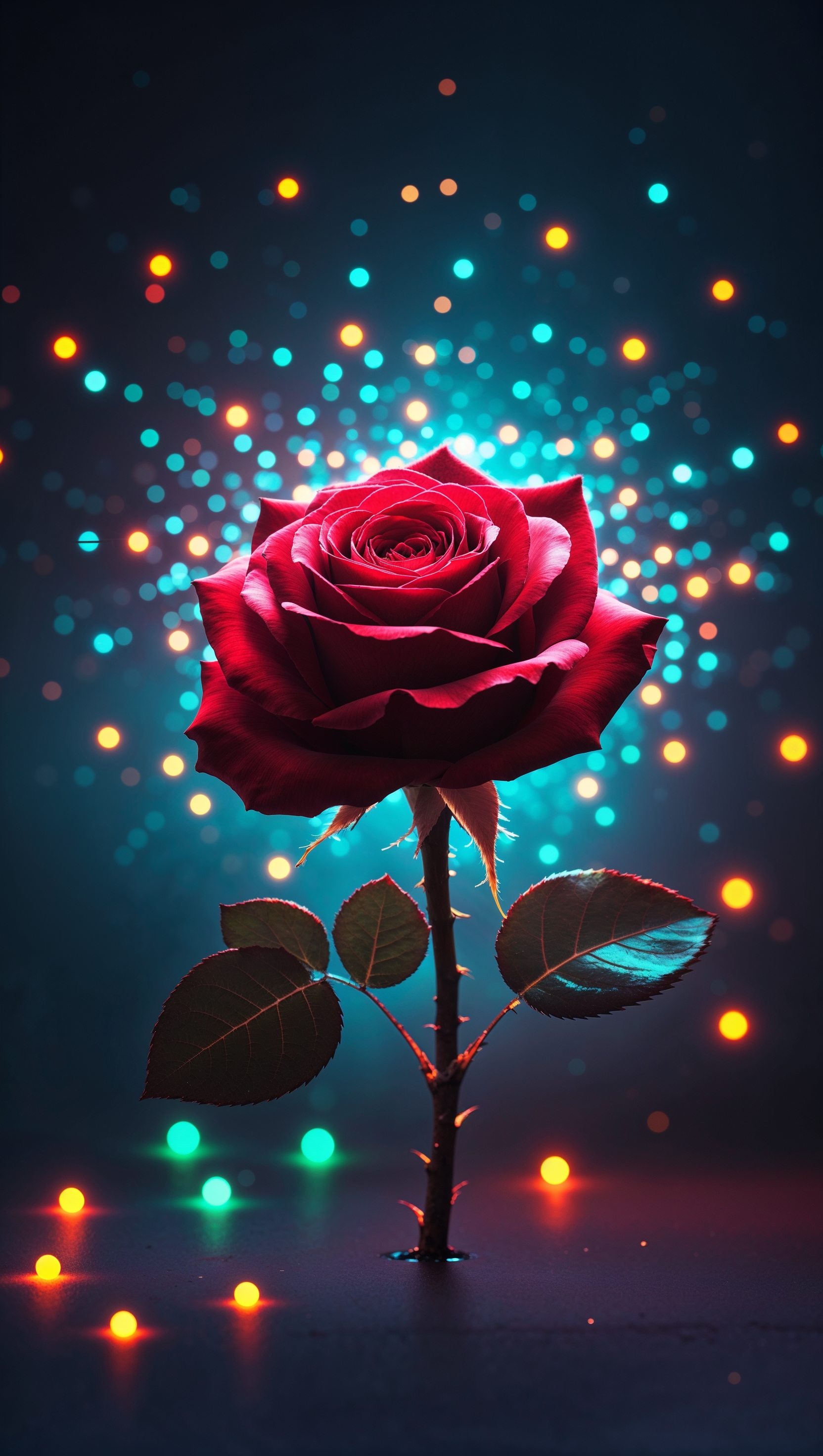 1664x2944 iPhone wallpaper with a red rose and dark background with colorful lights