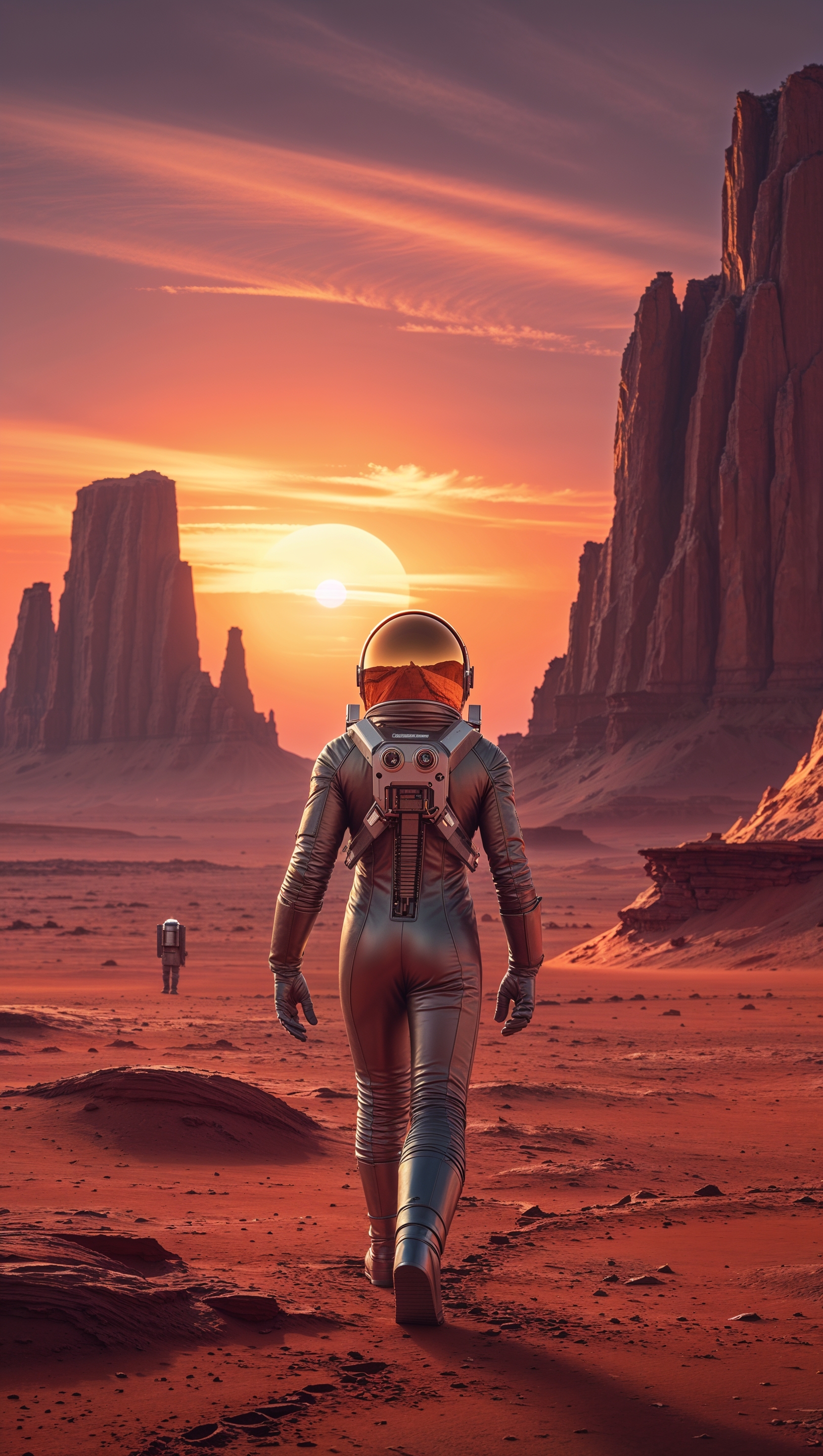1664x2944 Astronaut walking on Mars at sunset, sci-fi landscape, high quality for iPhone