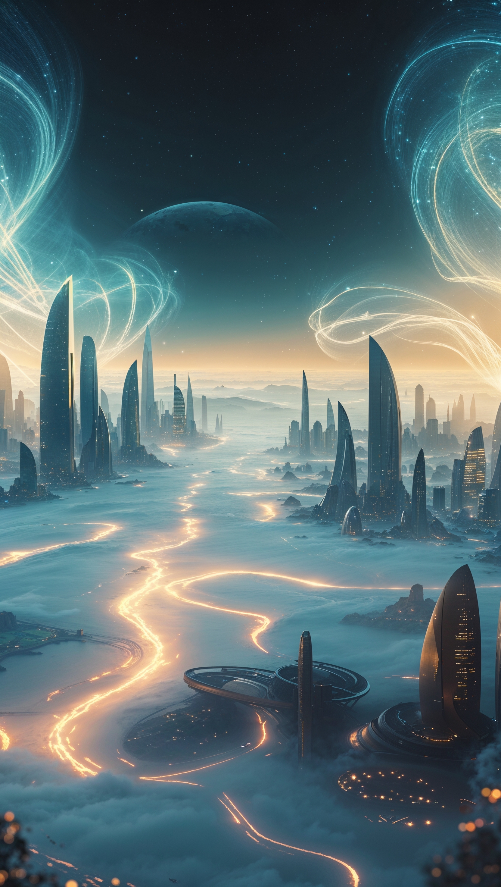 1664x2944 Futuristic city in space, misty lights, visionary background for iPhone, 4K