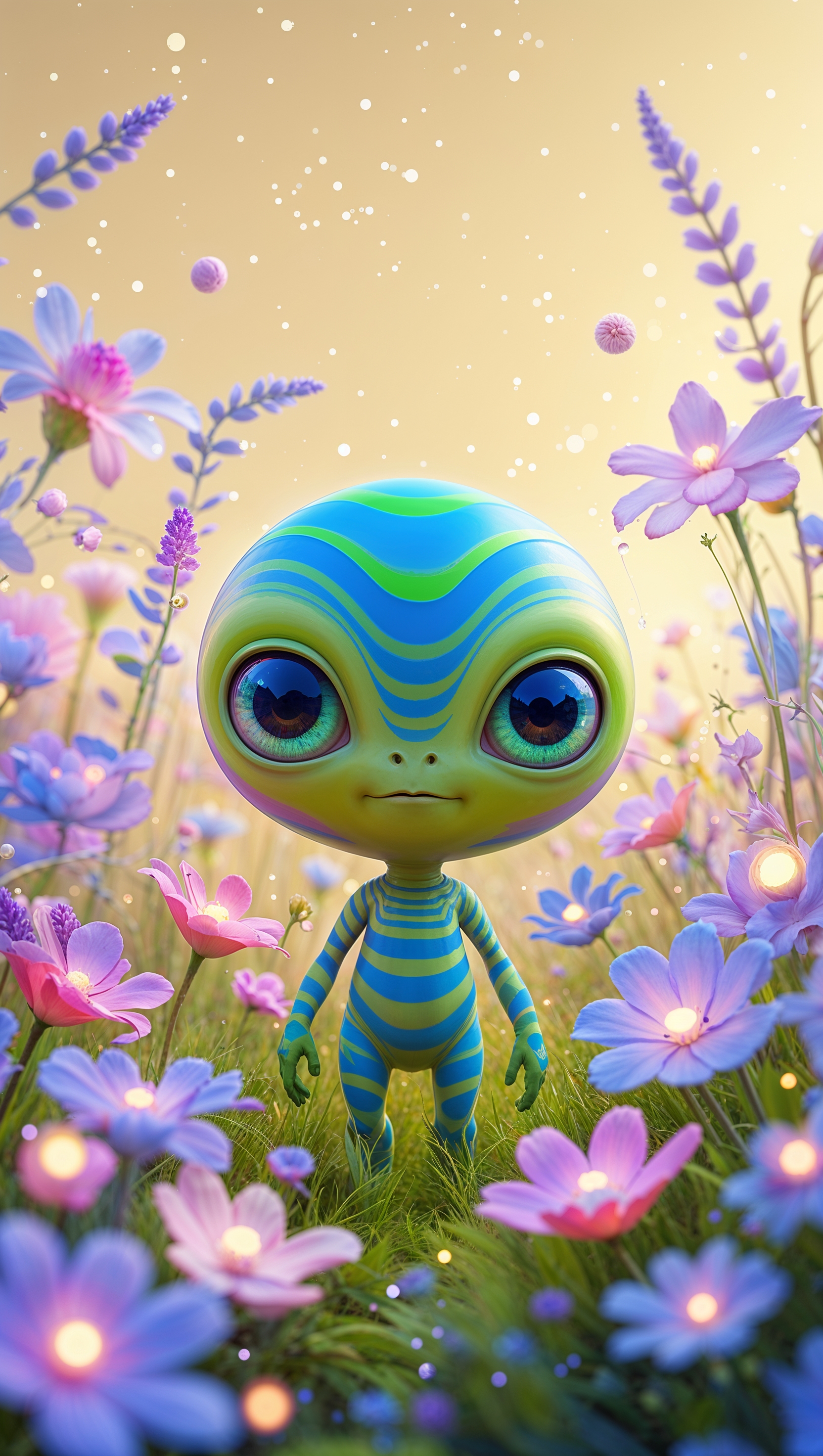 1664x2944 Cute alien in glowing flower field, childlike and fantasy mix, 4K iPhone wallpaper