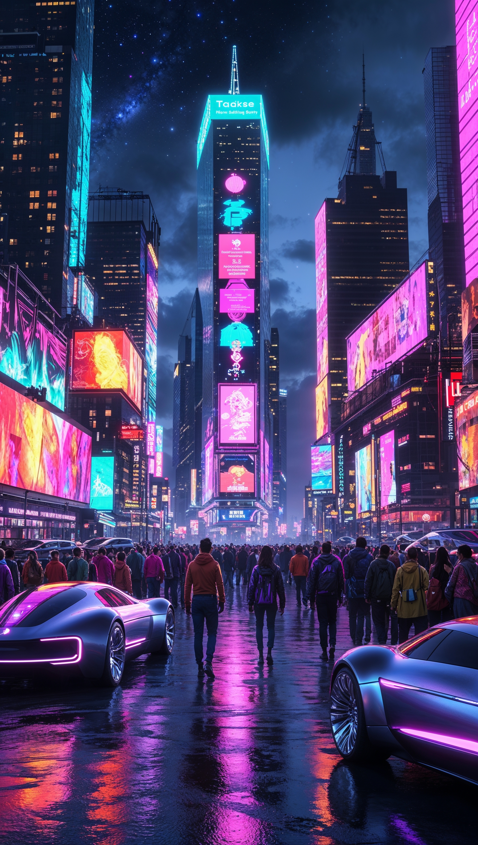 1664x2944 Cyberpunk-style Times Square at night, glowing billboards