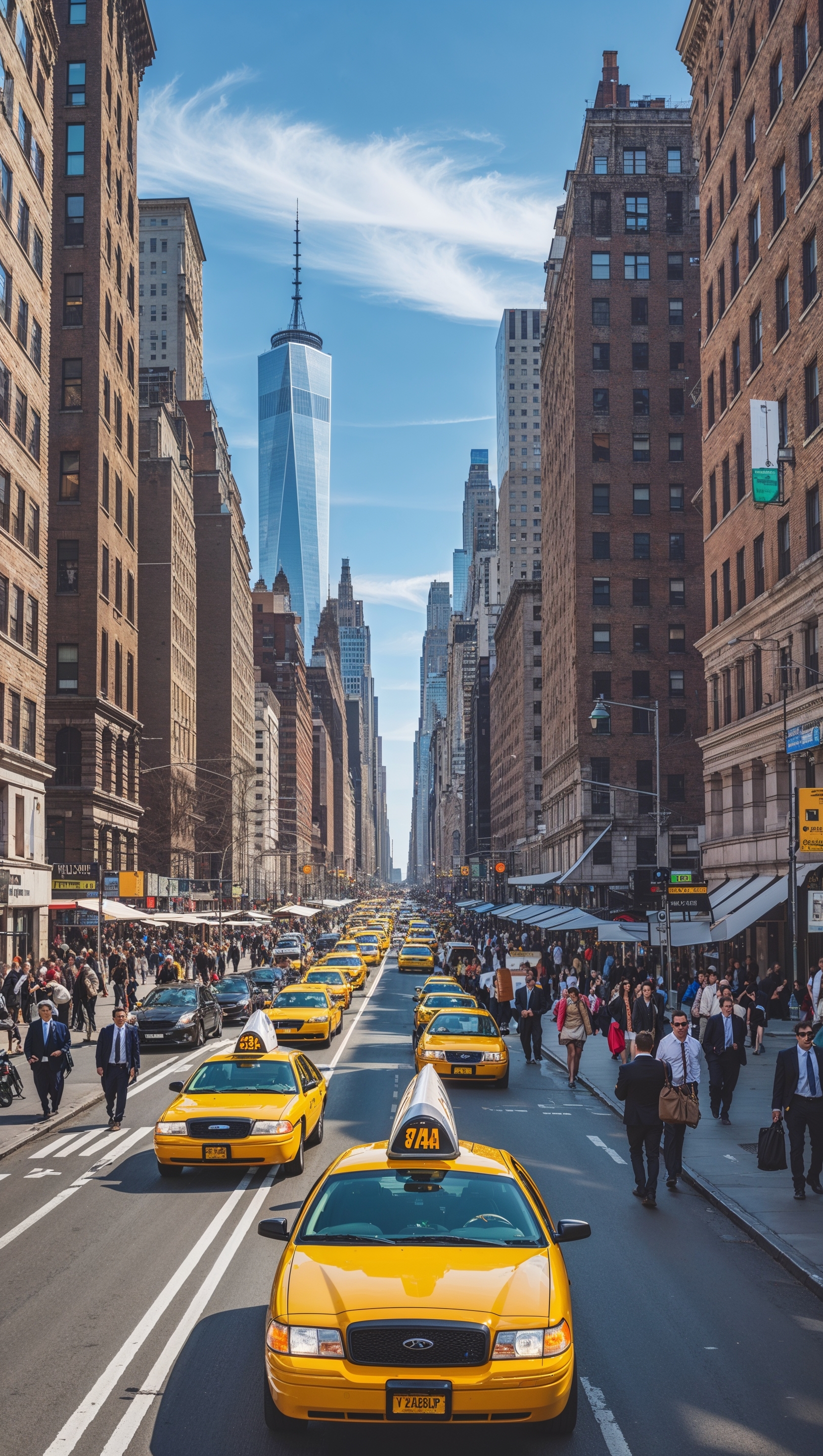 1664x2944 New York street with yellow cabs and tall buildings, sunny day