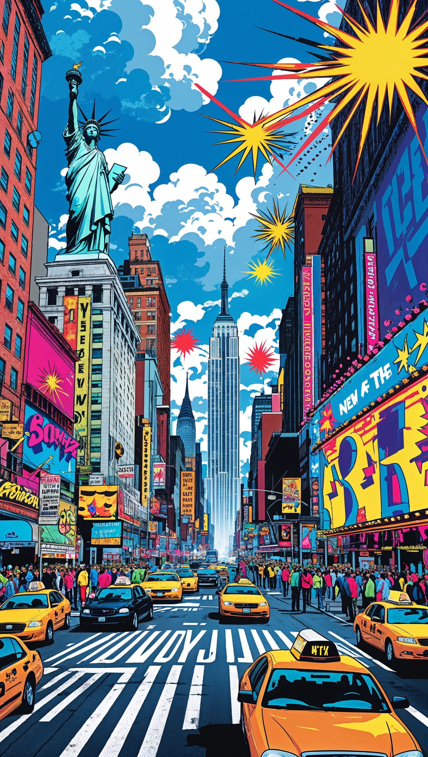 1664x2944 Pop art style NYC scene with bright colors and comic effects