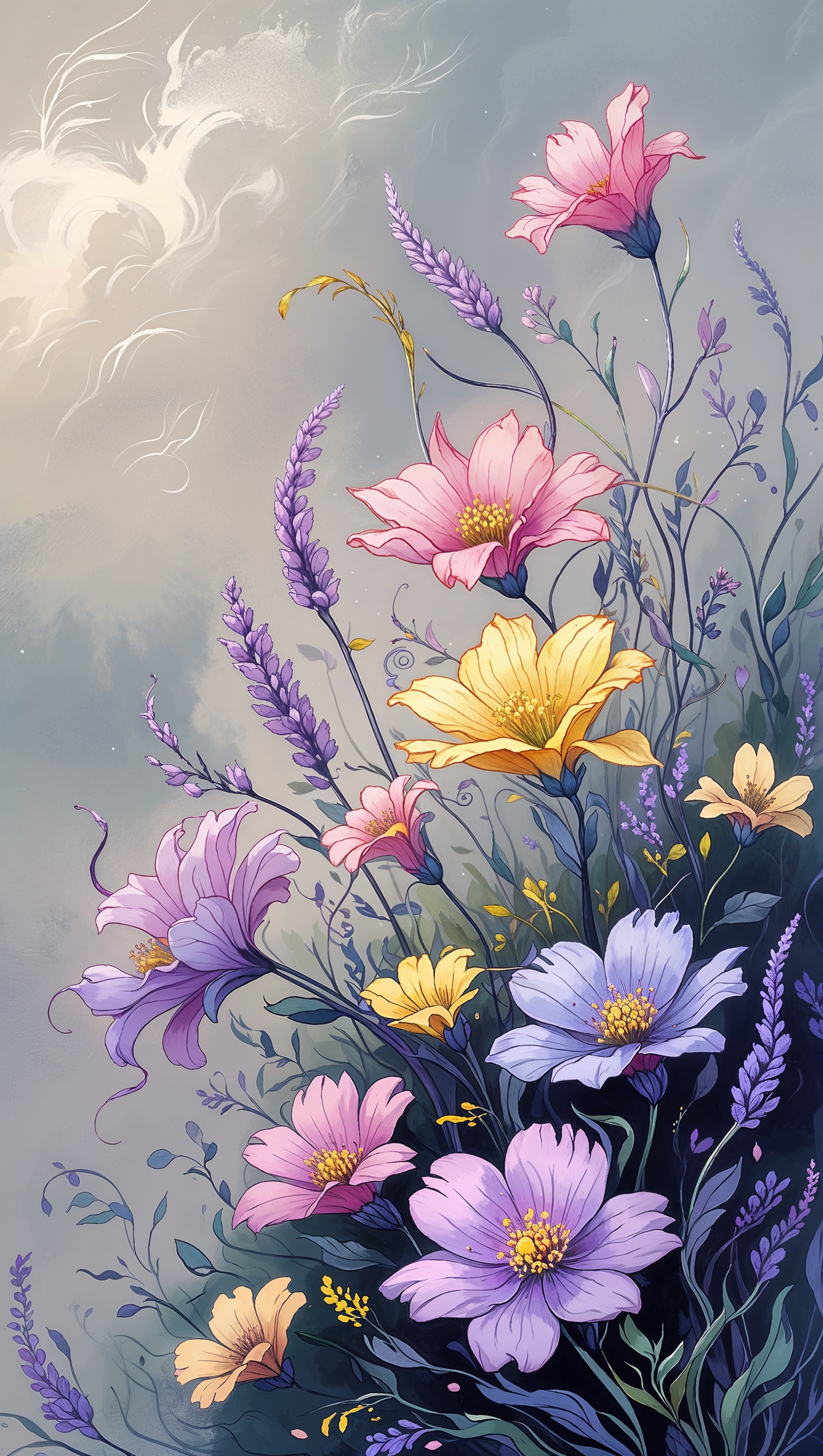 1664x2944 Fantasy wildflowers in storybook style, iPhone wallpaper
