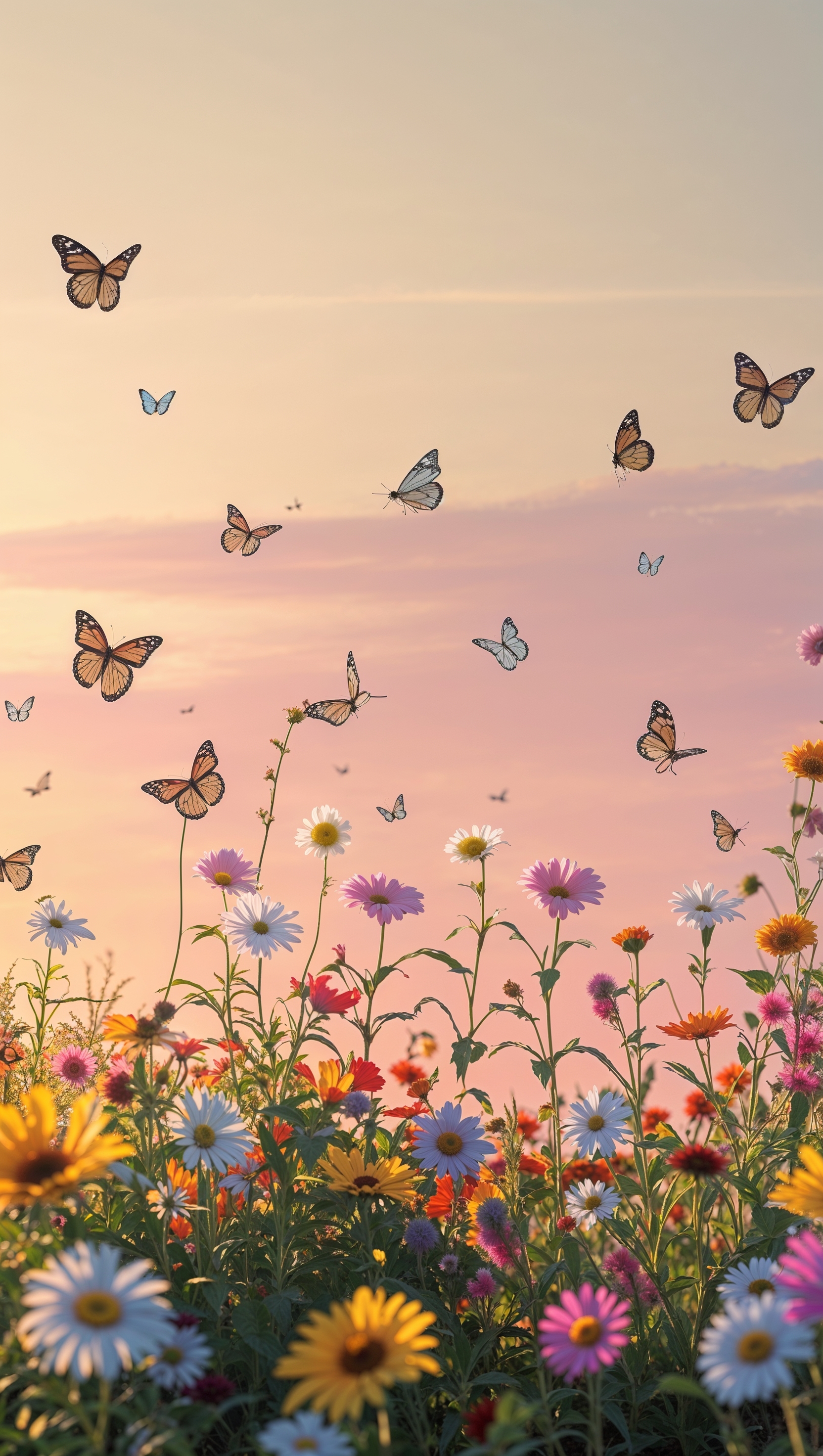 1664x2944 Wildflowers and butterflies at golden hour, iPhone wallpaper