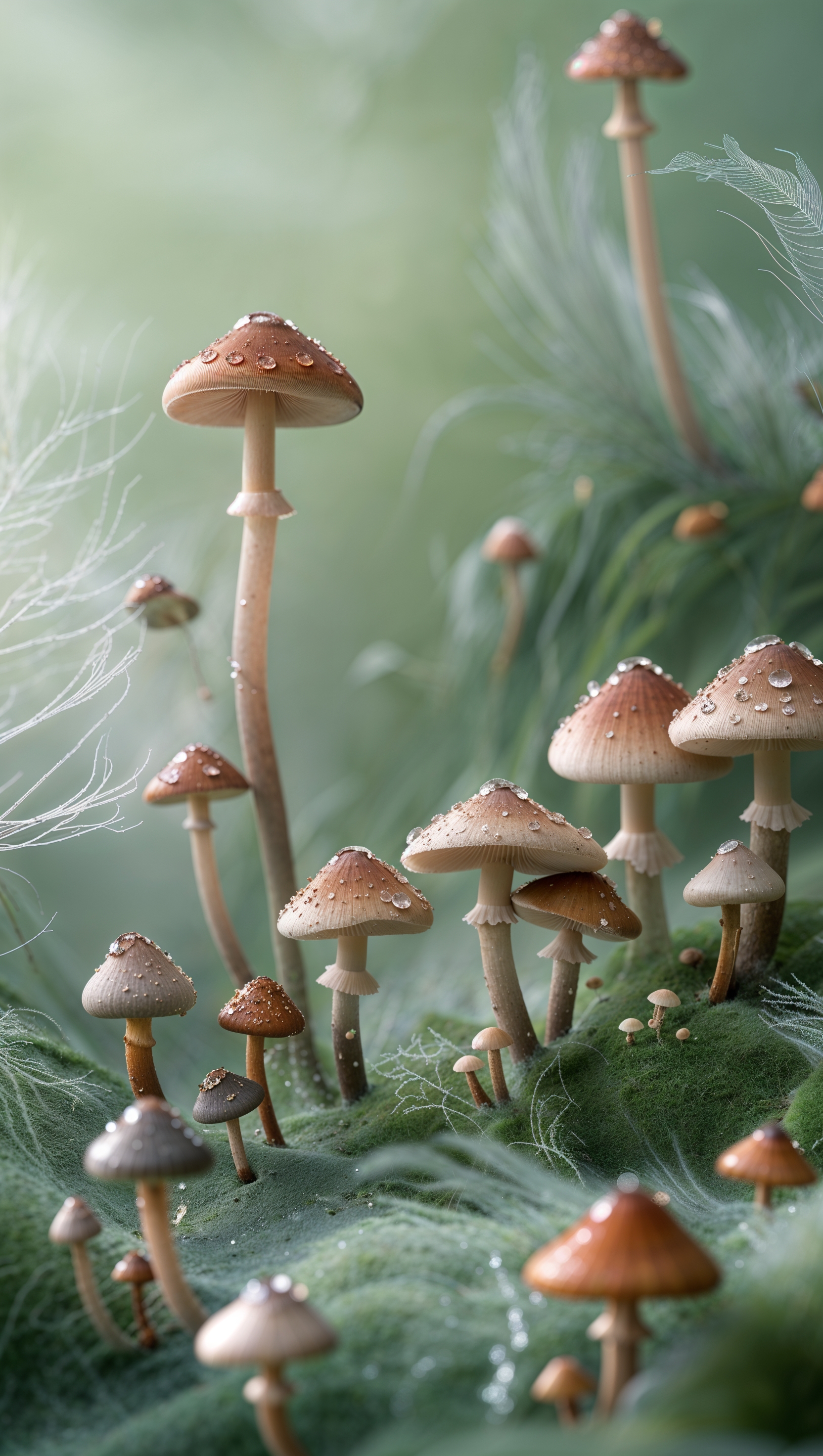 1664x2944 iPhone wallpaper with tiny mushrooms and dew drops