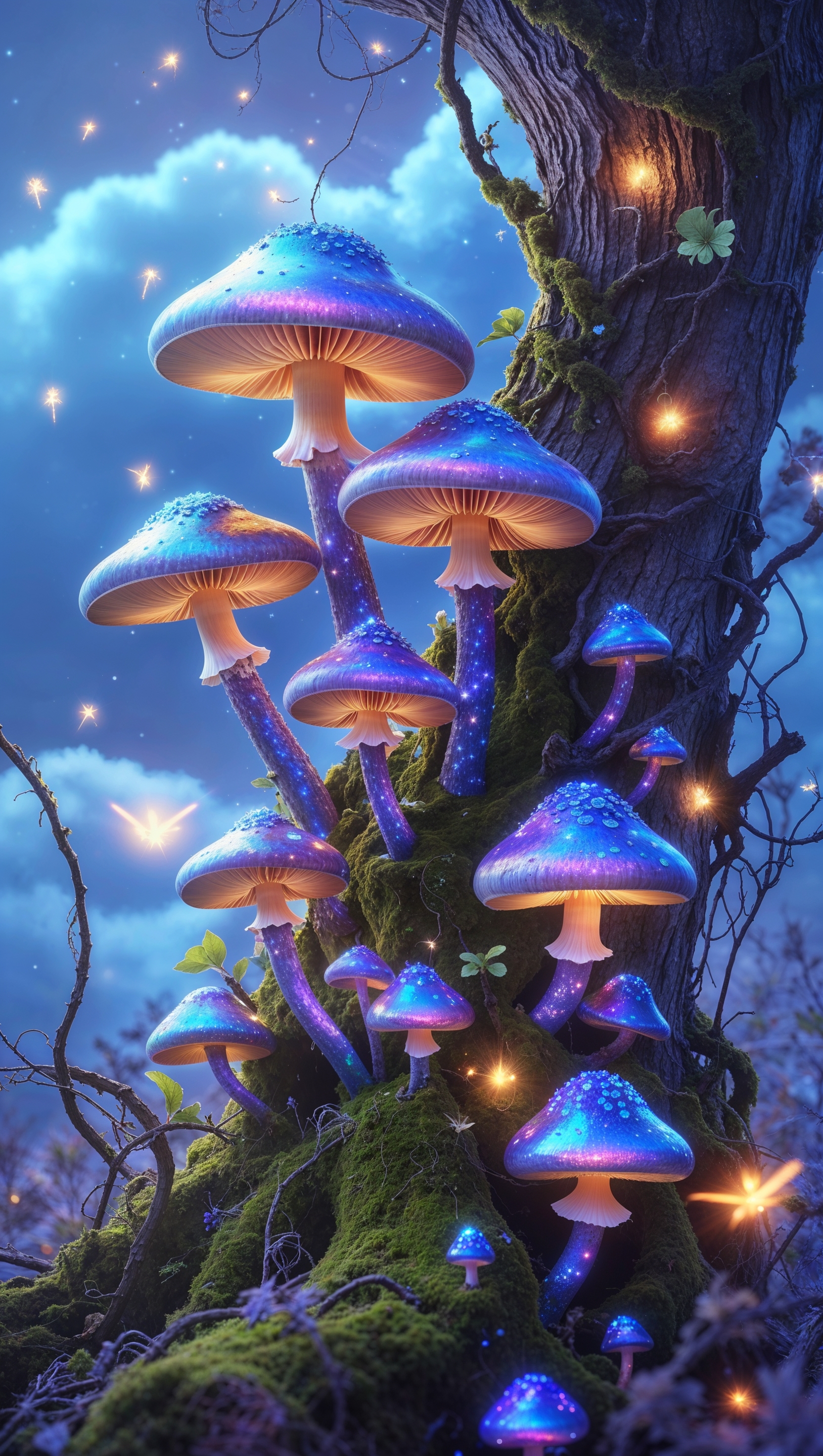 1664x2944 iPhone wallpaper with magical mushrooms and light effects