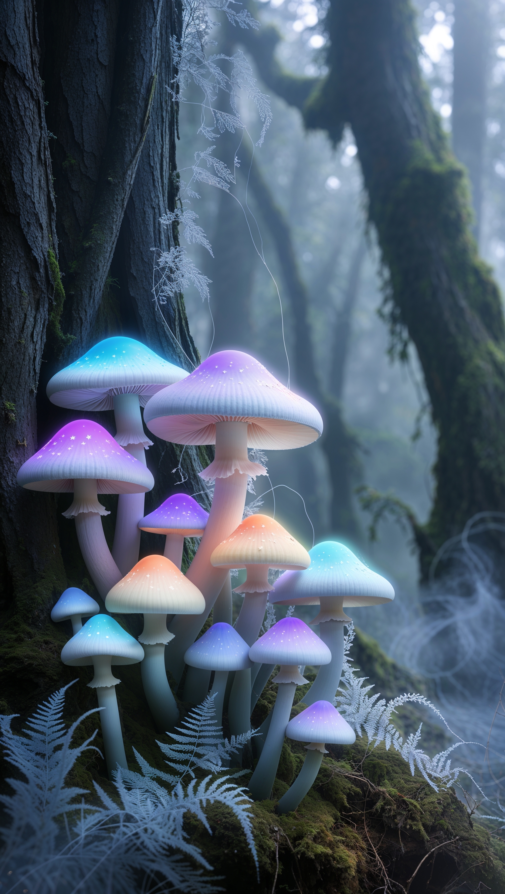 1664x2944 iPhone wallpaper with glowing mushrooms in foggy night