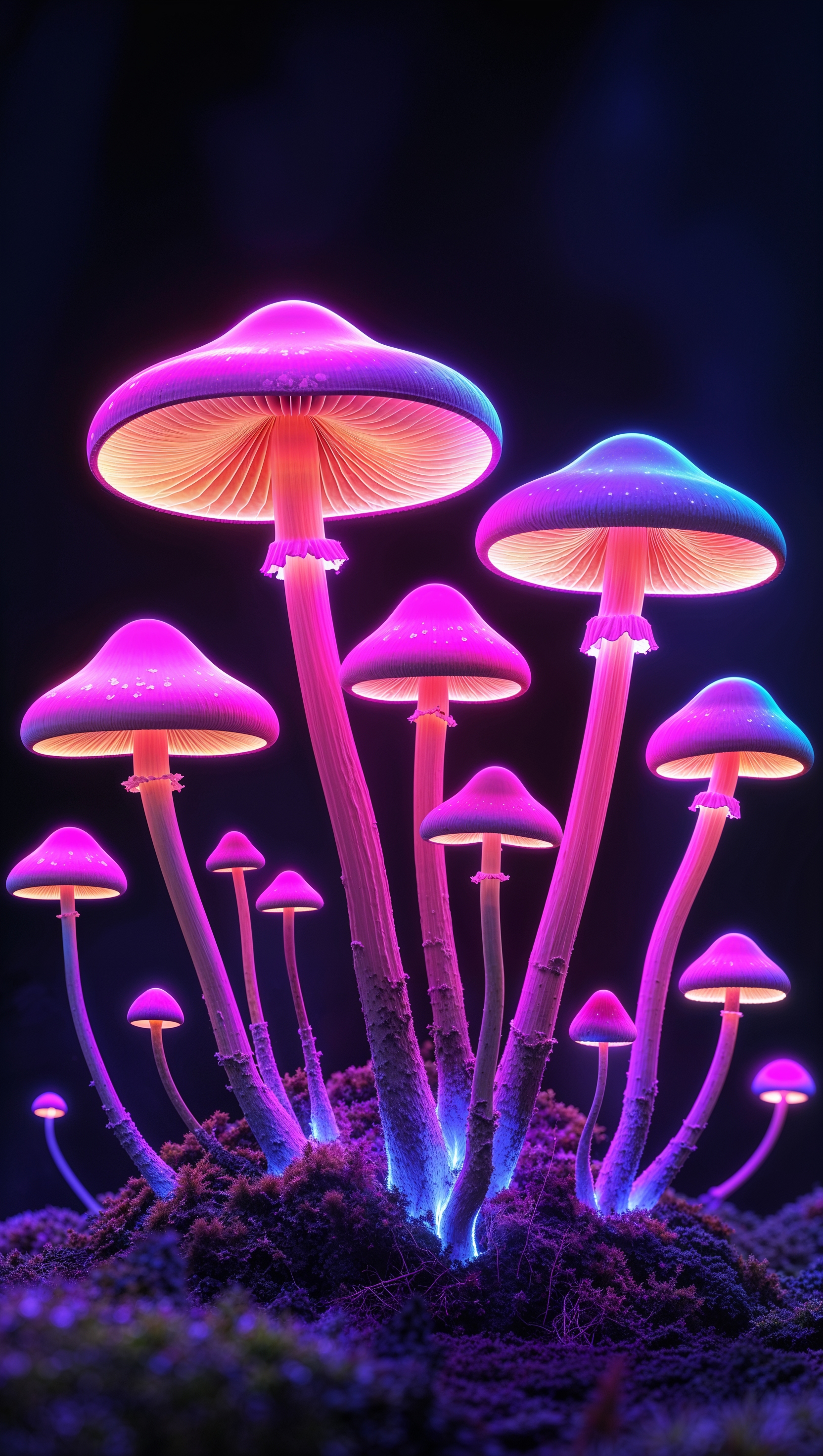 1664x2944 iPhone wallpaper with neon mushrooms on black background