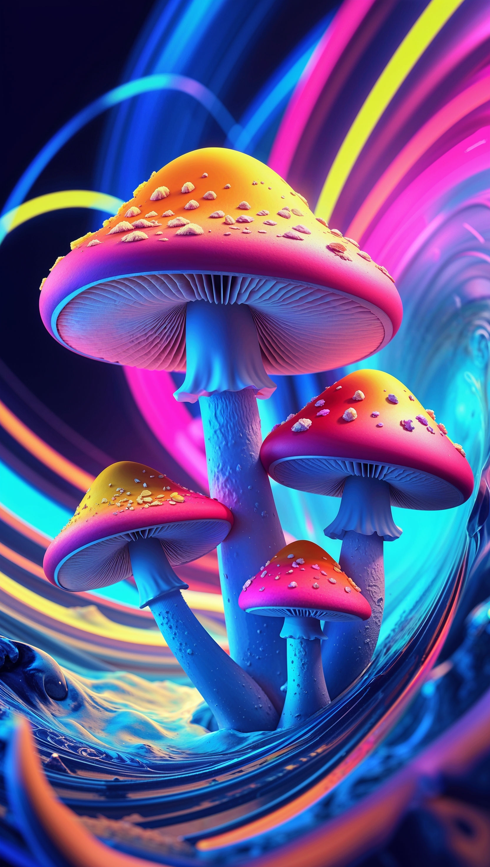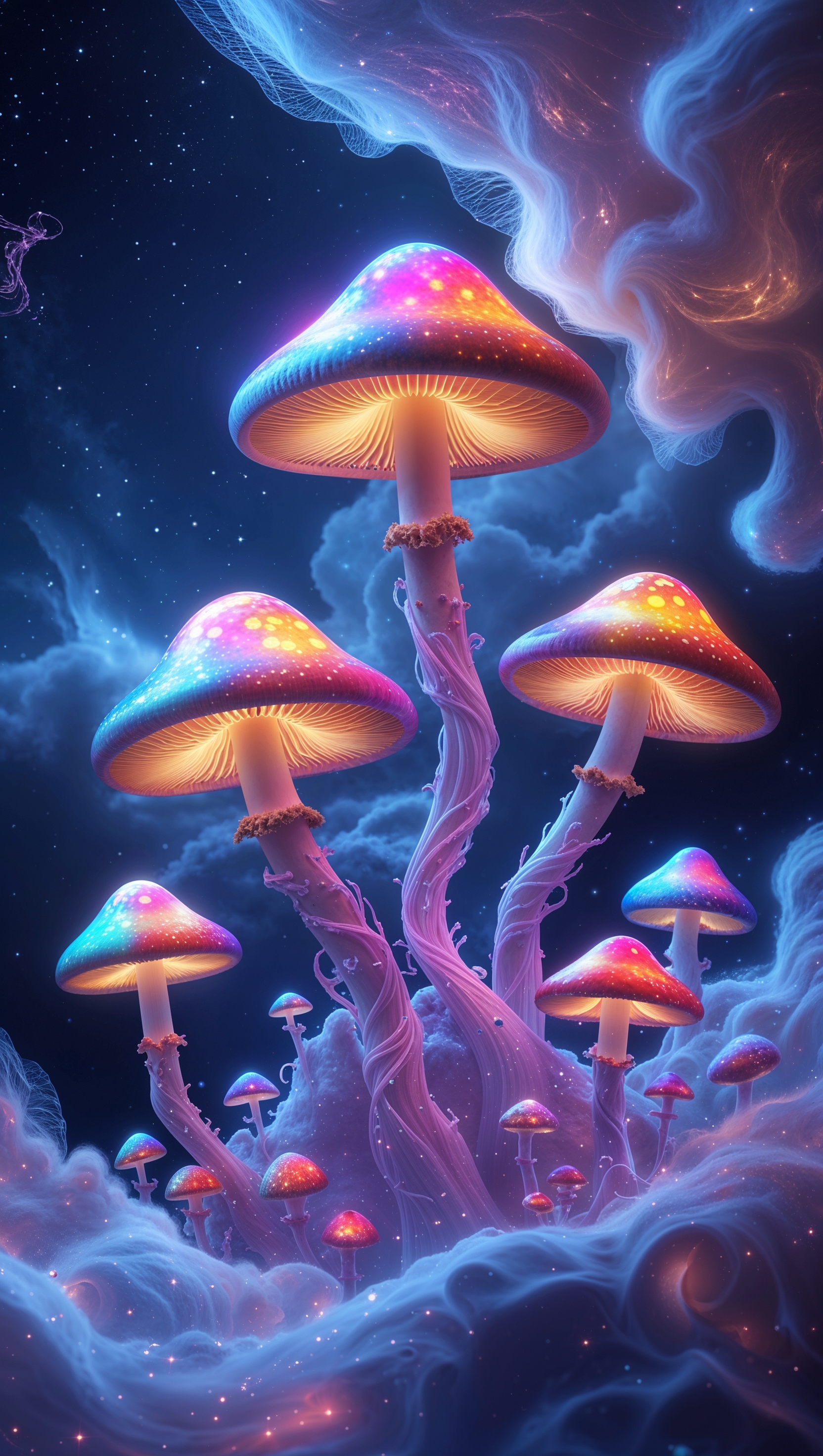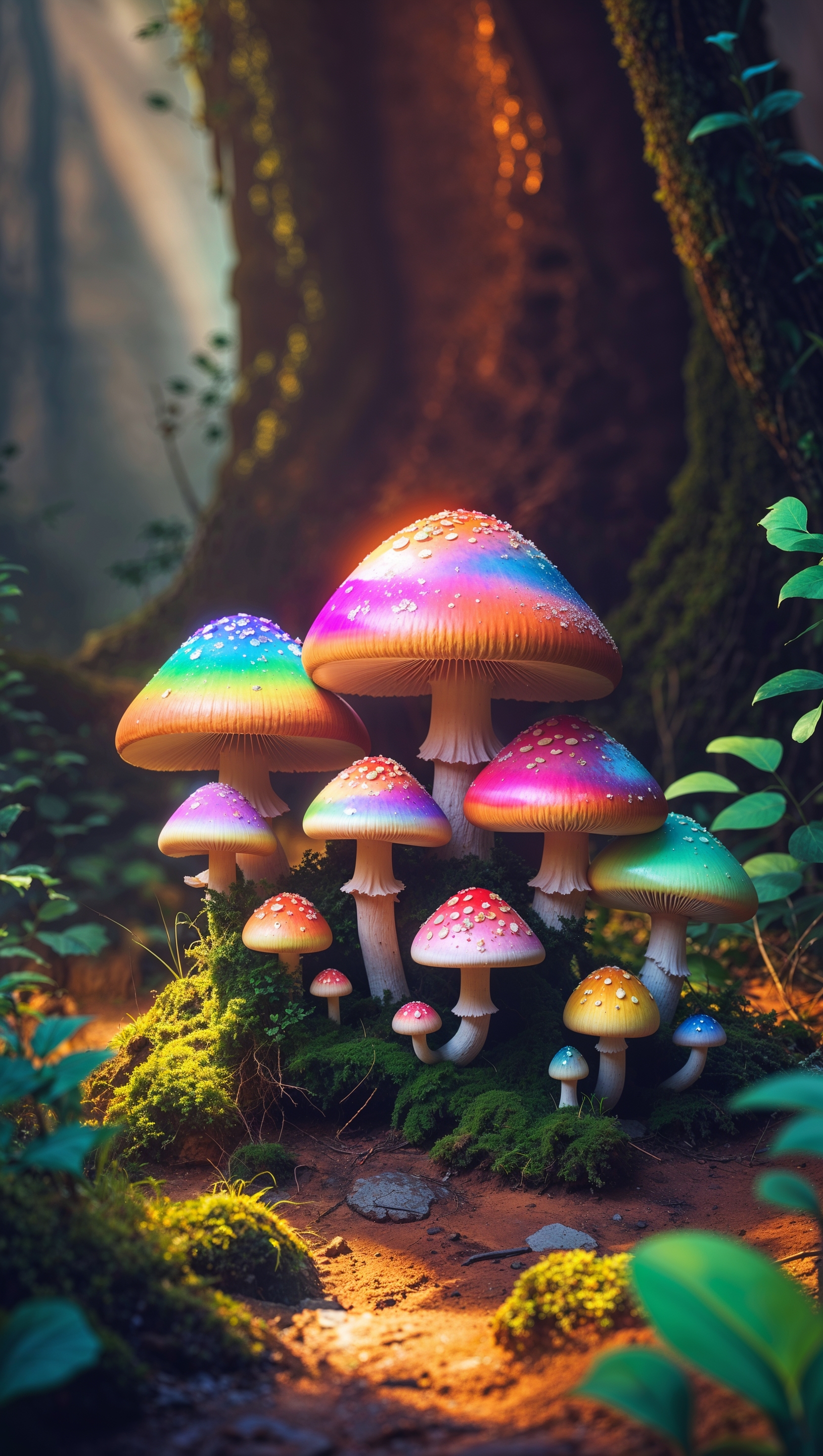 1664x2944 iPhone wallpaper with rainbow-colored mushrooms and chiaroscuro