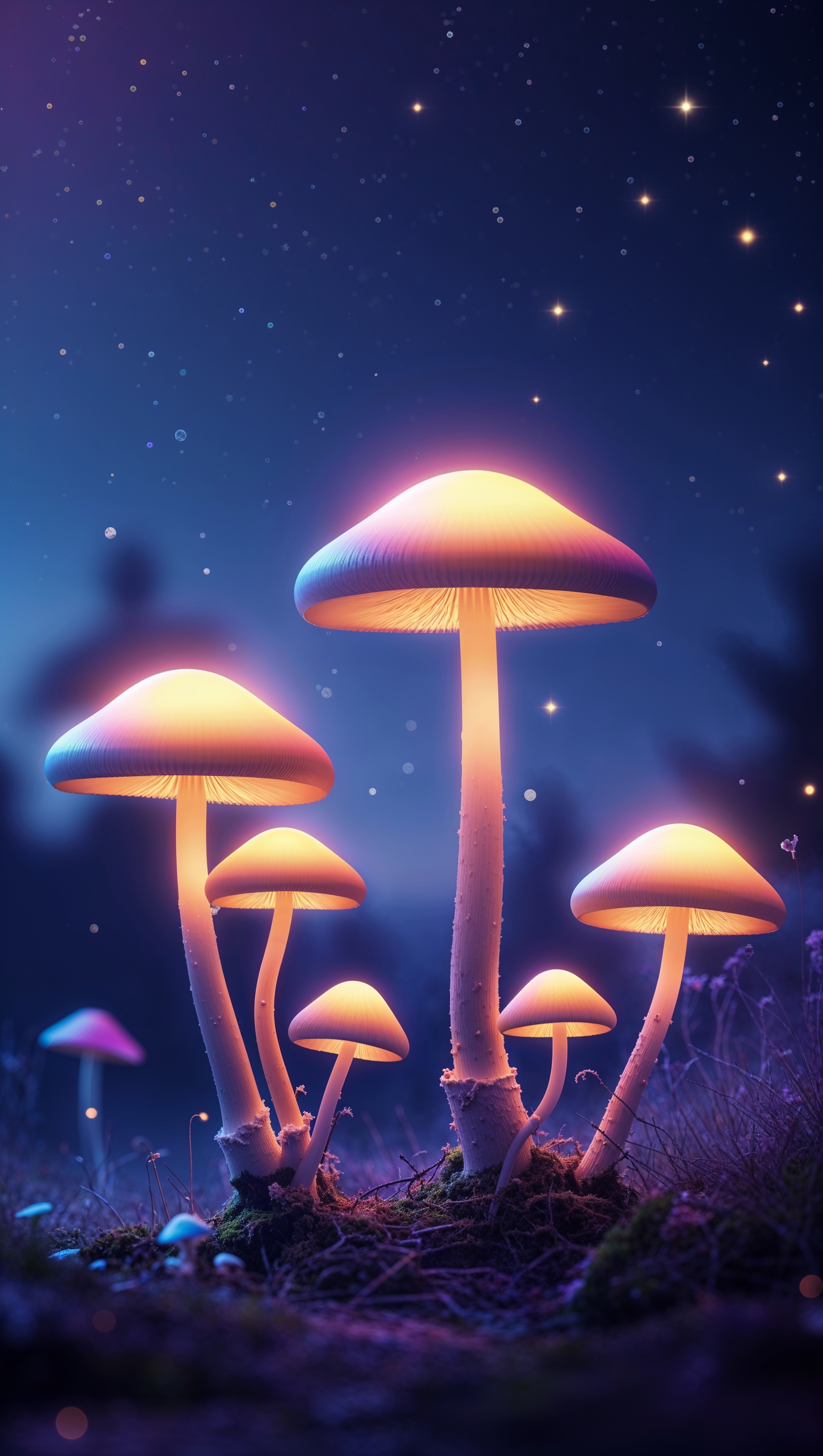 1664x2944 iPhone wallpaper with glowing mushrooms and night light effect