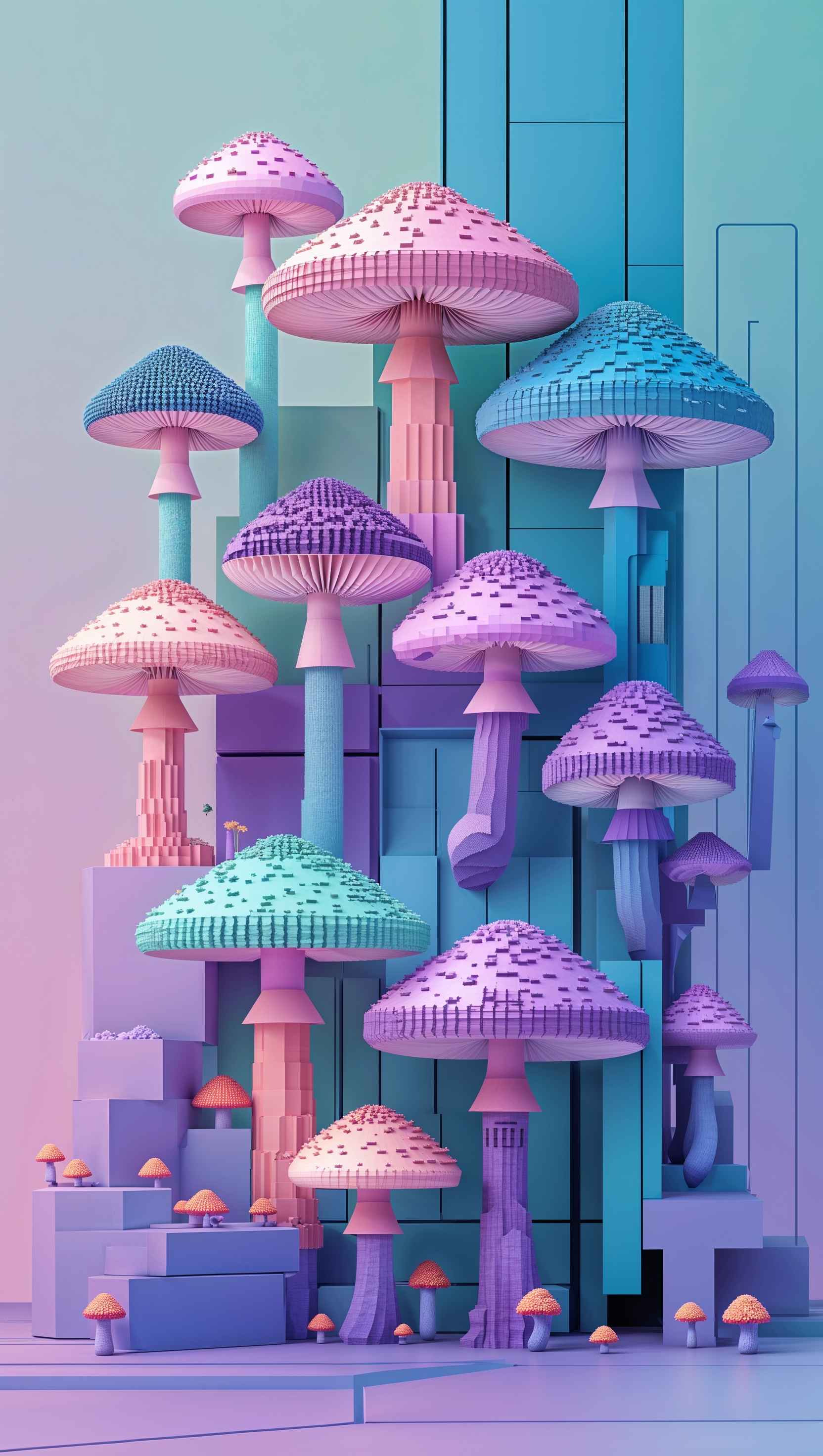 1664x2944 iPhone wallpaper with pixelated mushrooms and digital design