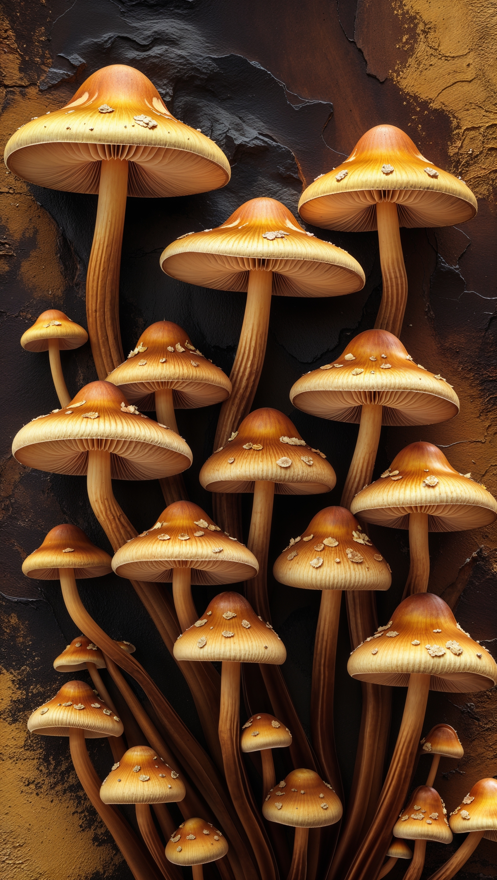 1664x2944 iPhone wallpaper with golden mushrooms on a dark background