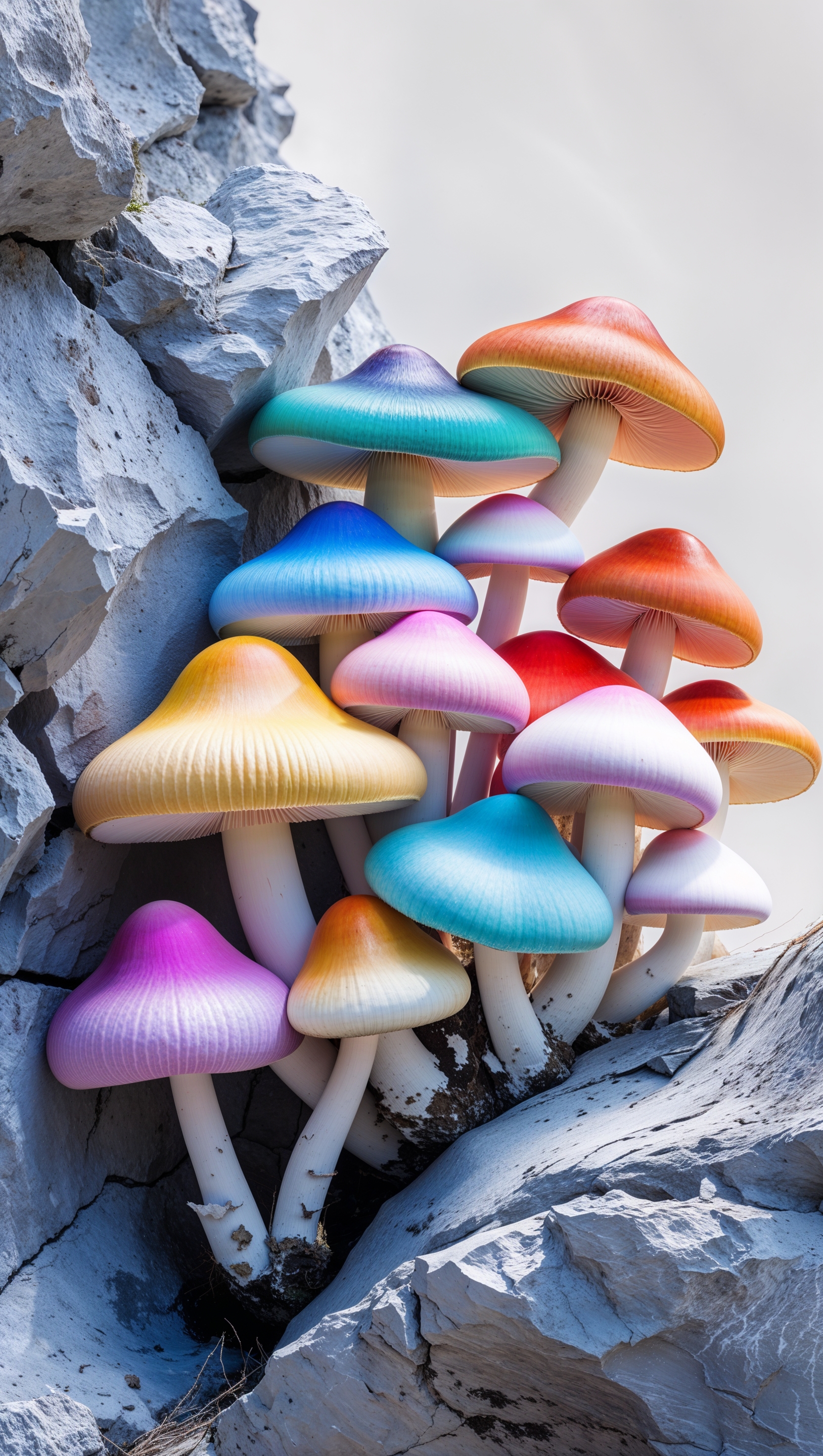 1664x2944 iPhone wallpaper with colorful mushrooms on a rocky surface