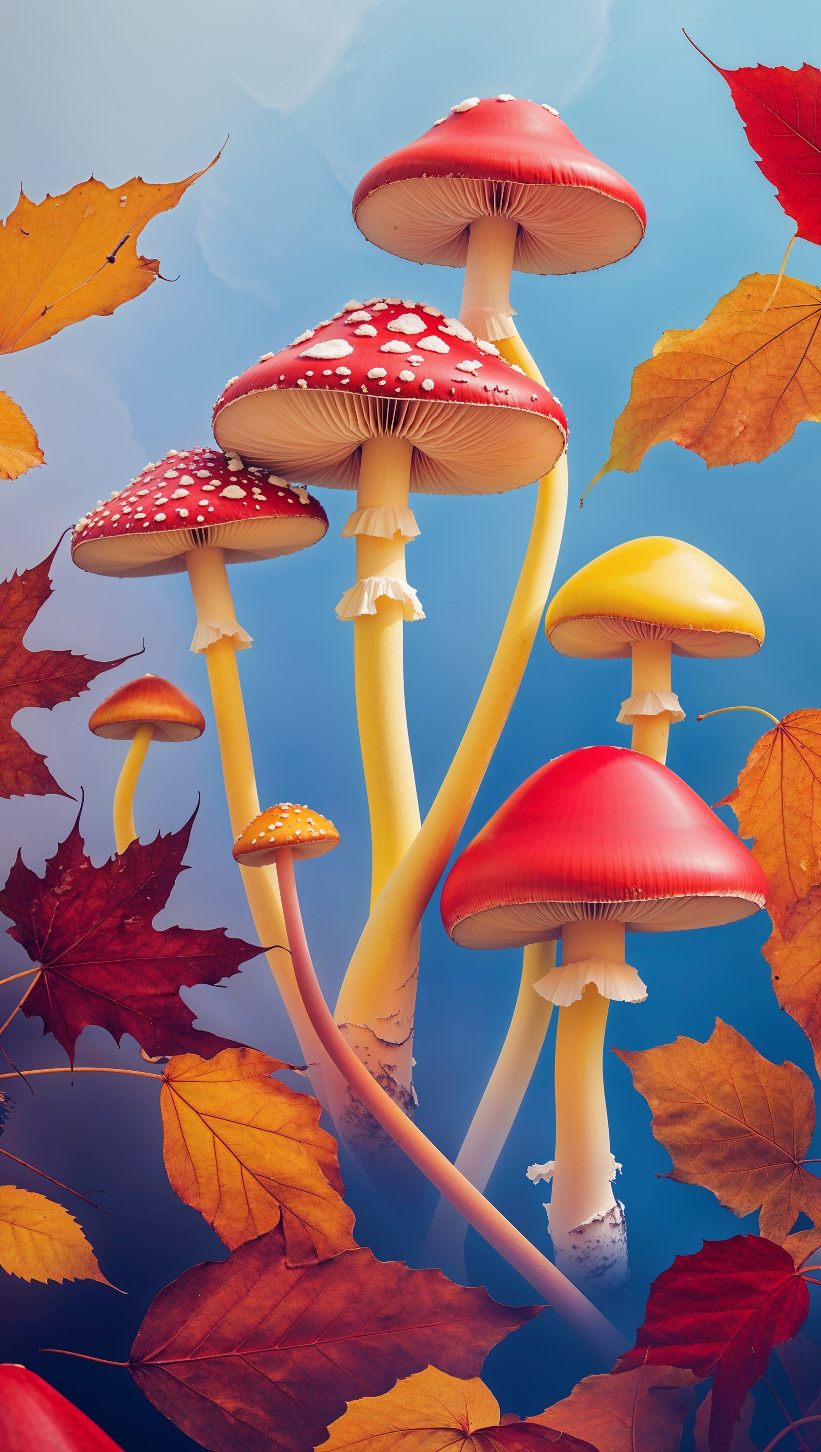 1664x2944 iPhone wallpaper with colorful mushrooms and autumn leaves