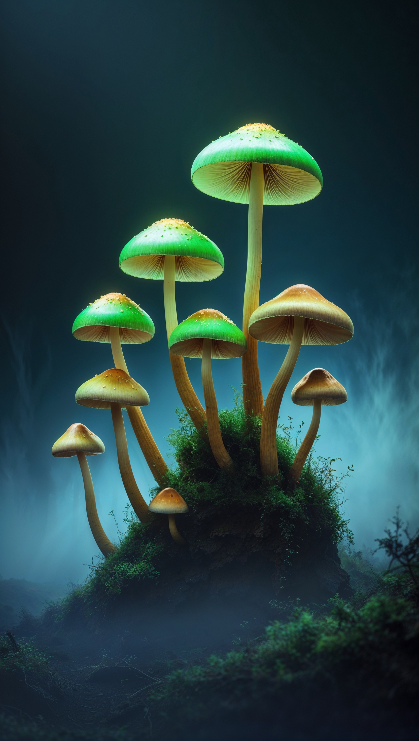 1664x2944 iPhone wallpaper with green and golden mushrooms on dark background