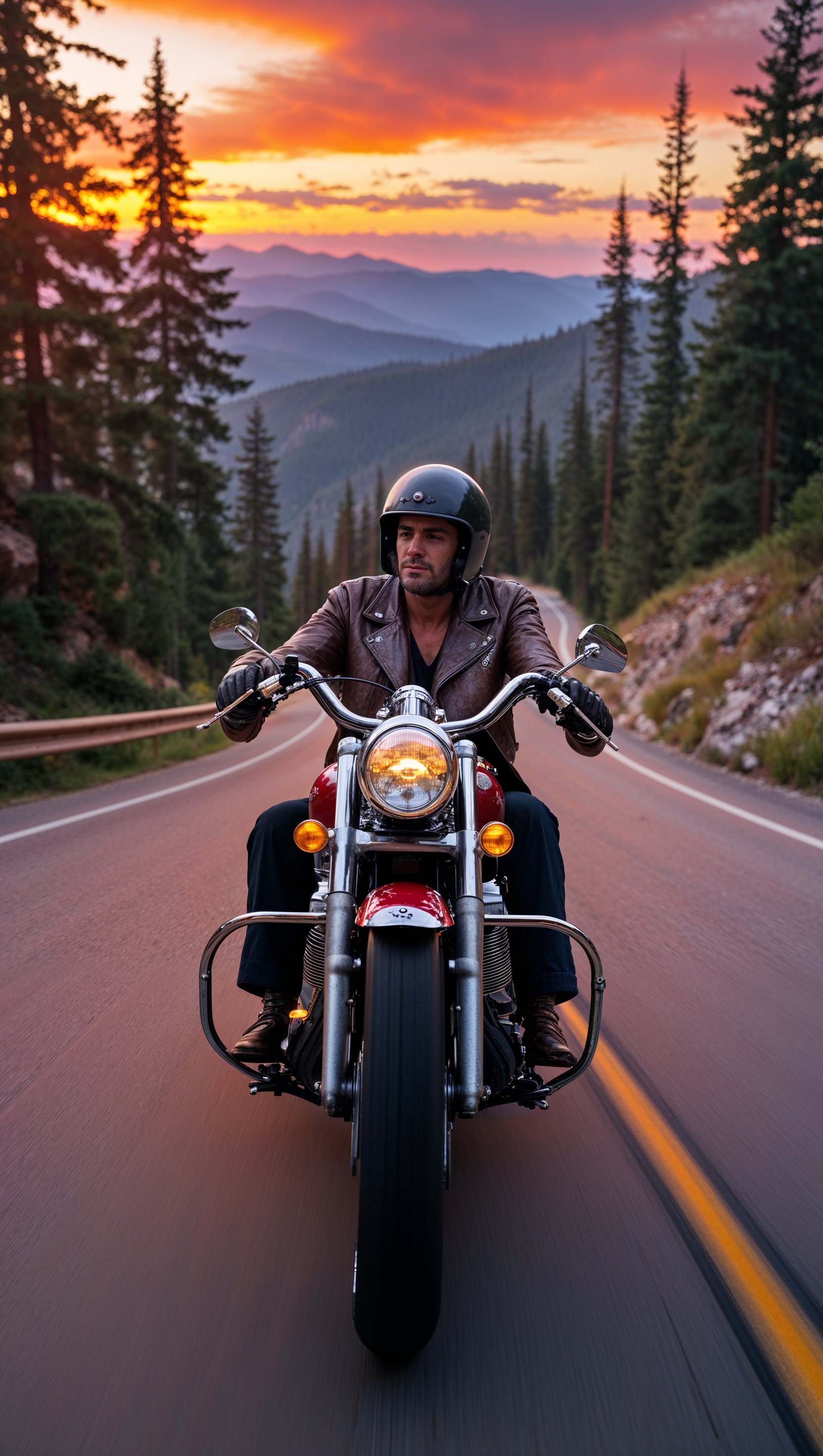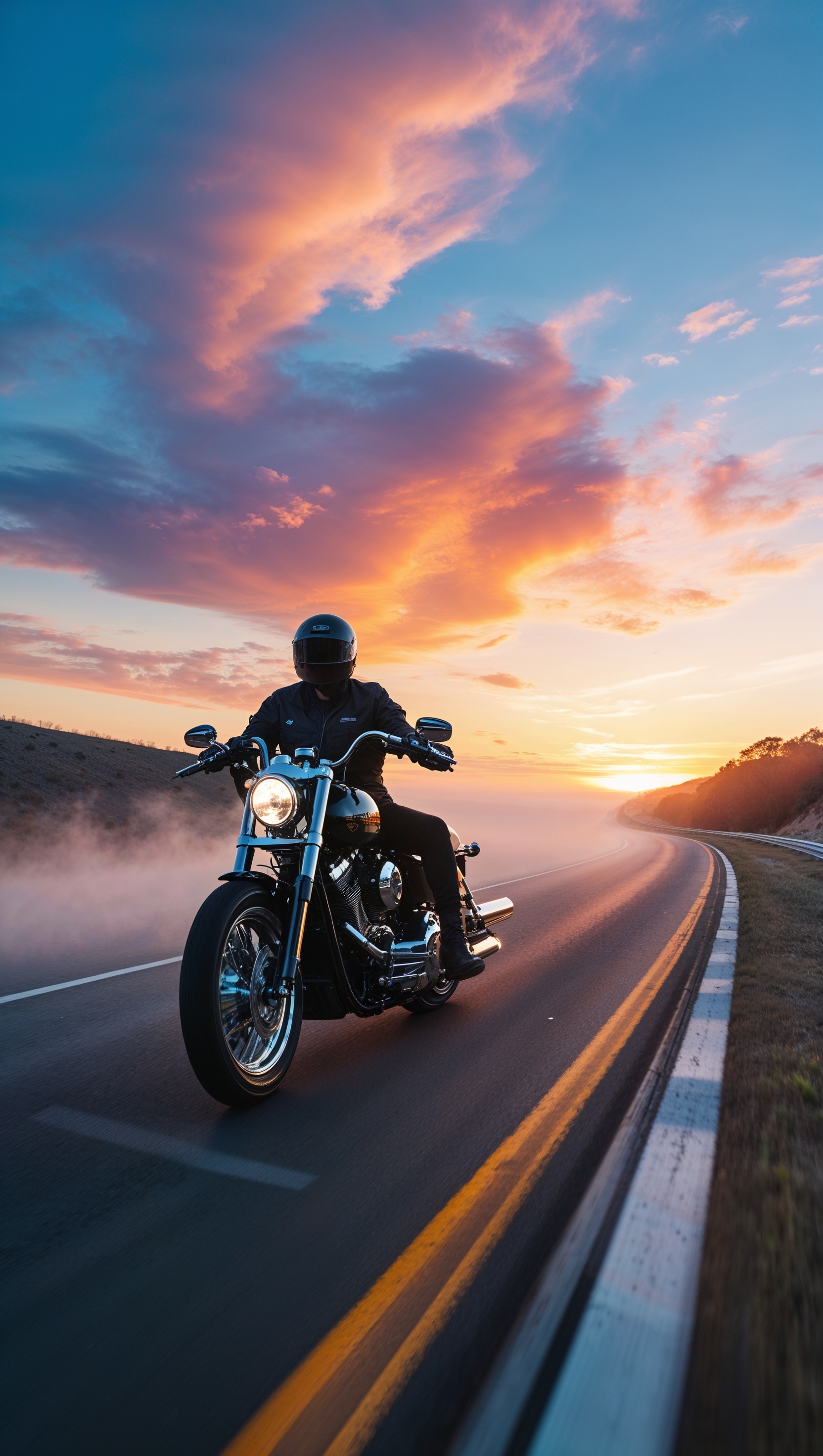 1664x2944 Harley Davidson motorcycle on a mountain road with sunset sky