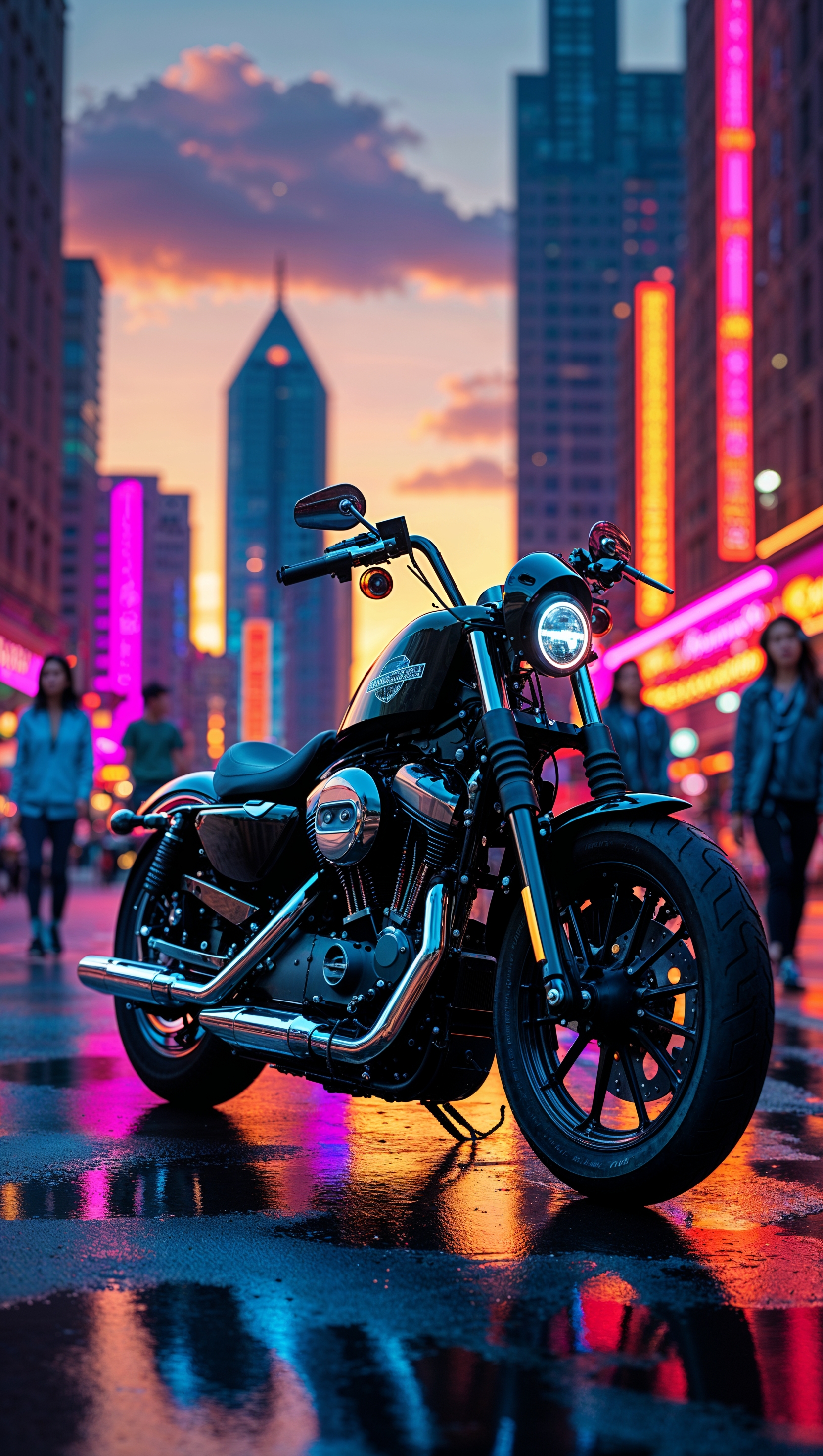 1664x2944 Harley Davidson at urban sunset with neon lights