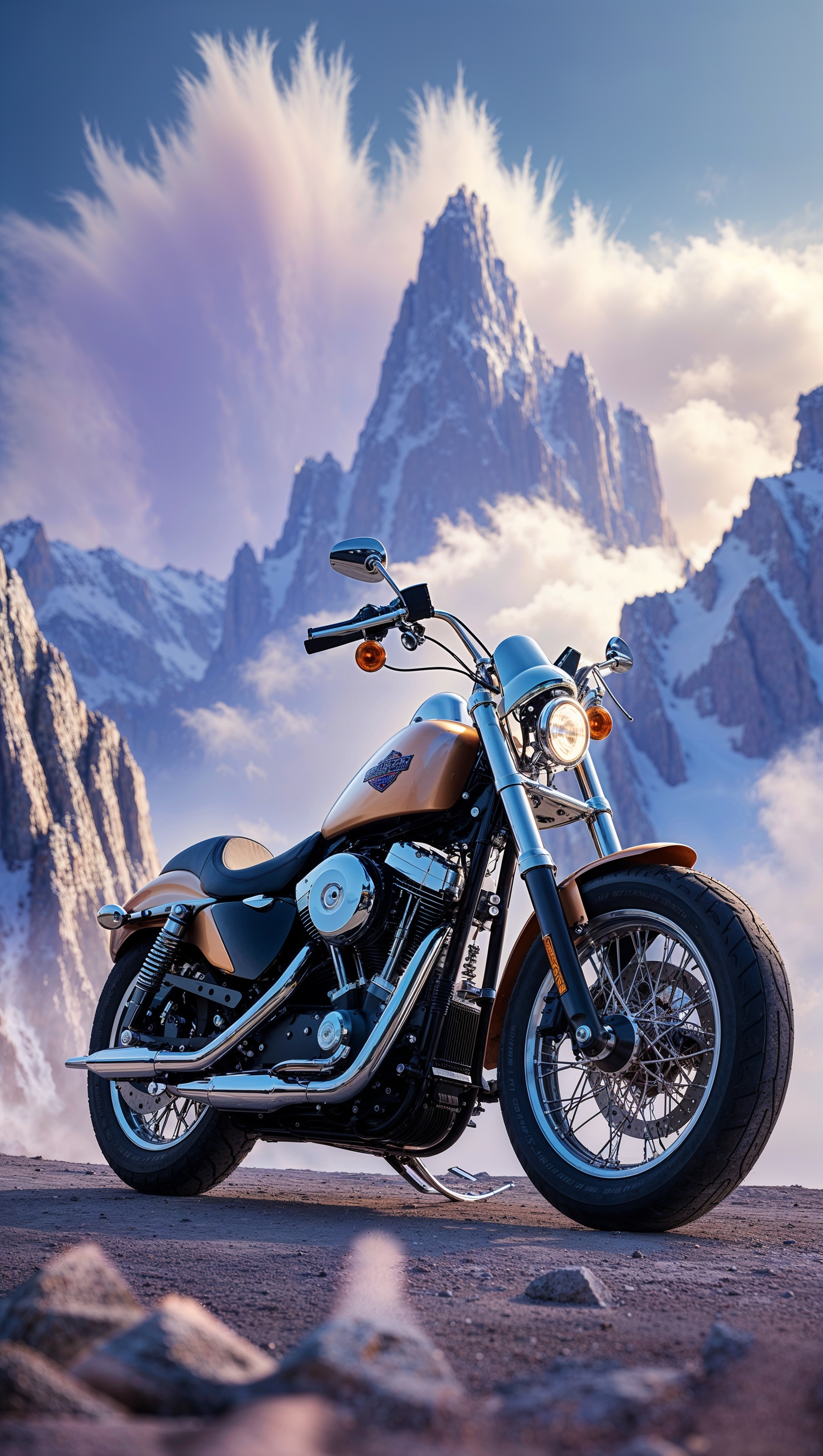 1664x2944 Harley Davidson in a fantasy landscape with mountains and clouds