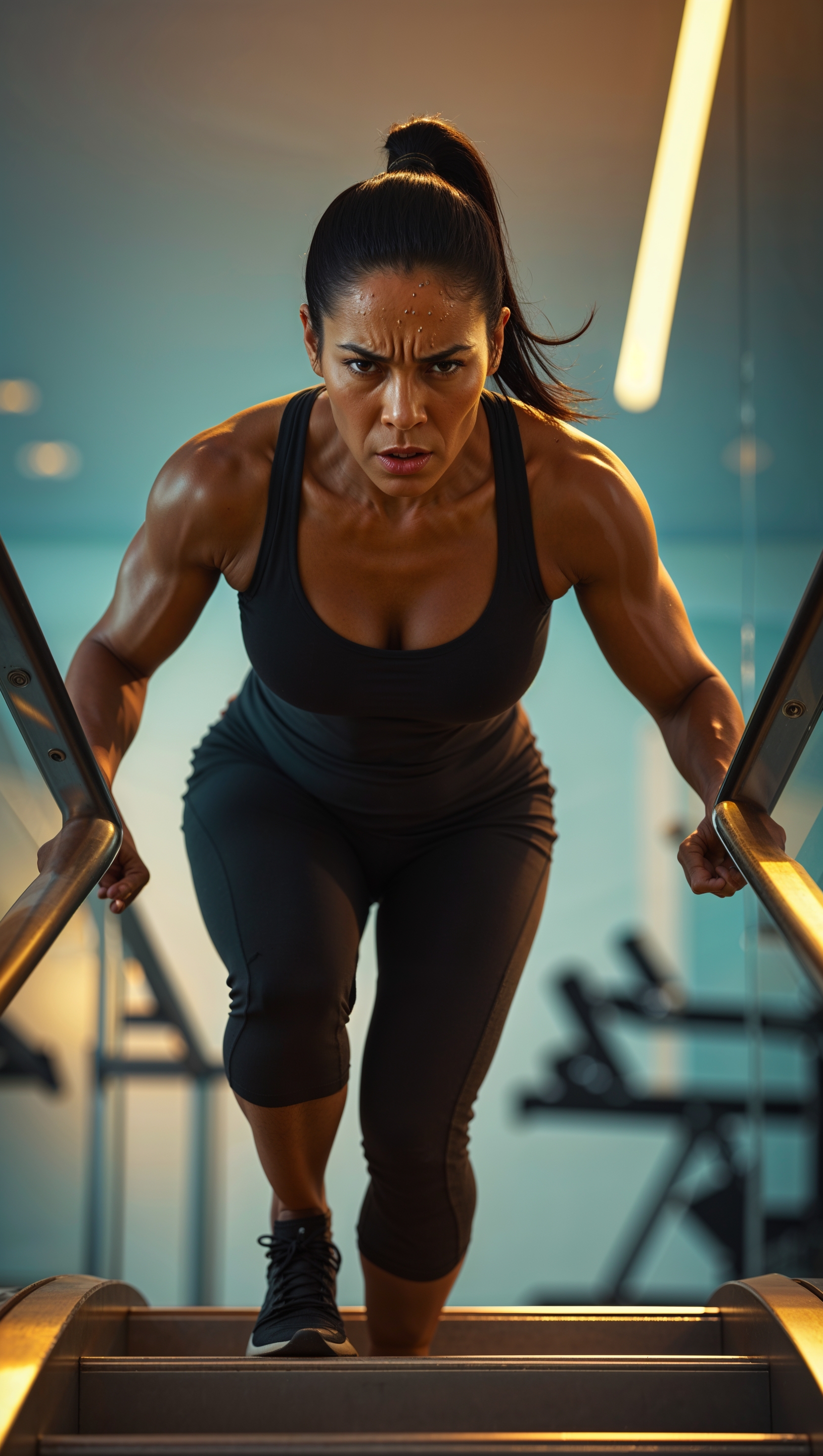 1664x2944 Modestly dressed woman climbing stairs, motivational fitness scene