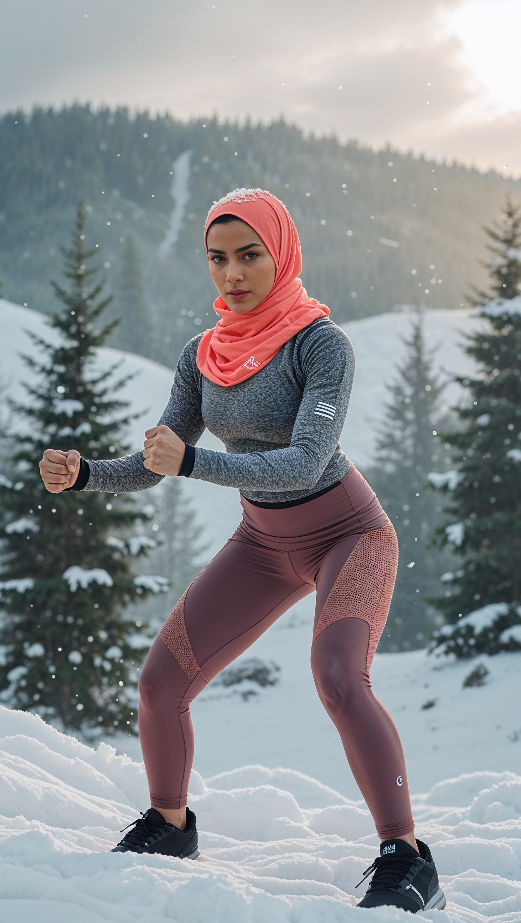 1664x2944 Hijabi girl training in snowy nature, fitness aesthetic