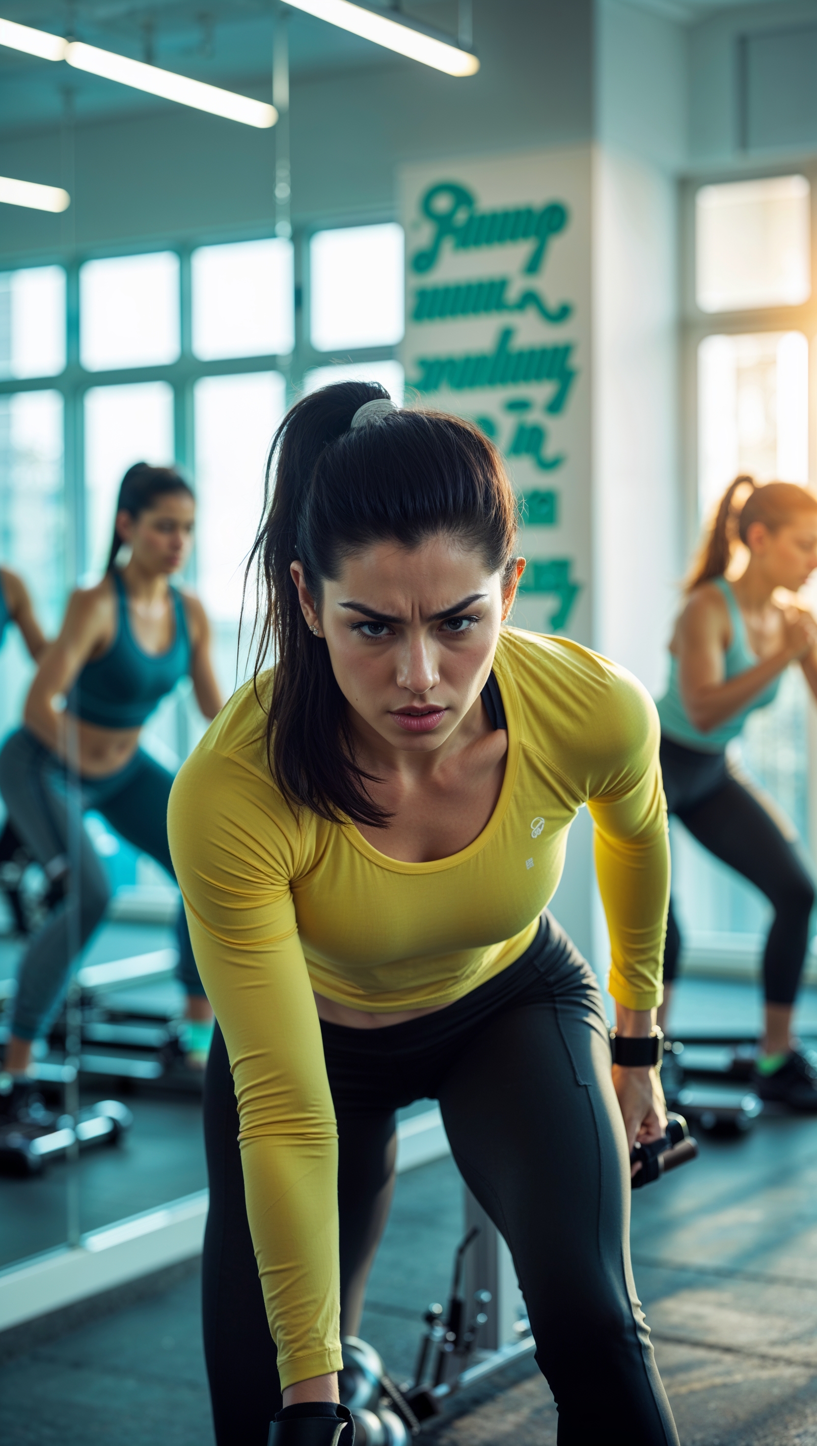 1664x2944 Fully covered woman training with dumbbells, fitness aesthetic