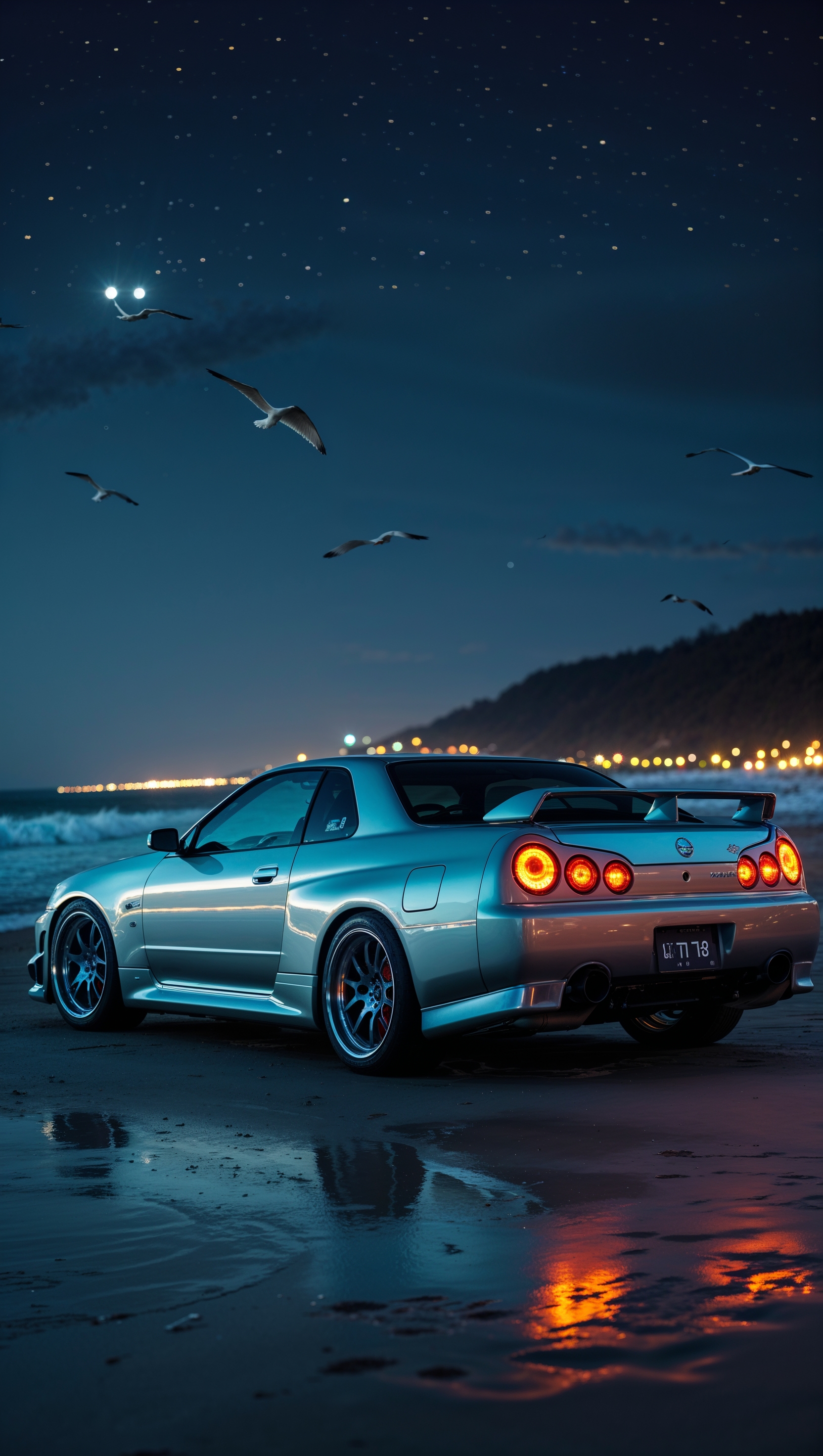 Nissan Skyline R34 parked near the beach at night 1664x2944 Nissan Skyline R34 parked near the beach at night