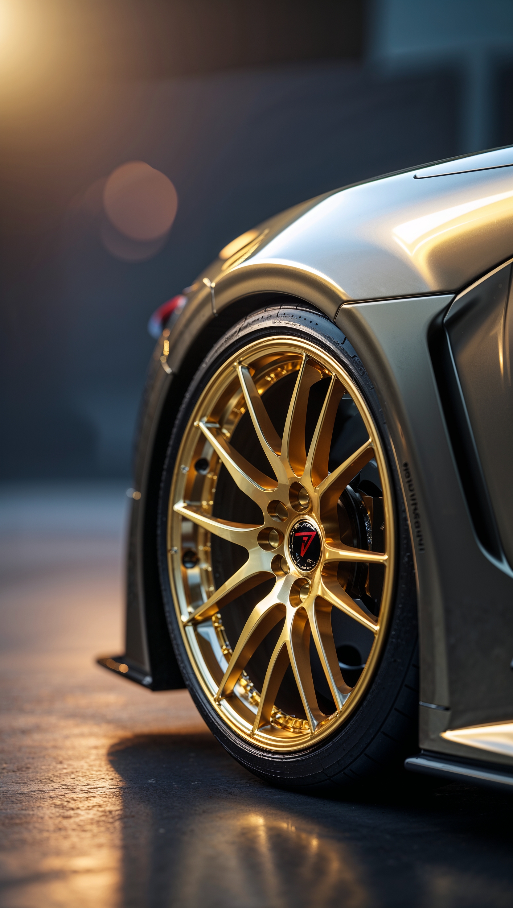 Close-up of a golden wheel on a JDM car with light reflection 1664x2944 Close-up of a golden wheel on a JDM car with light reflection