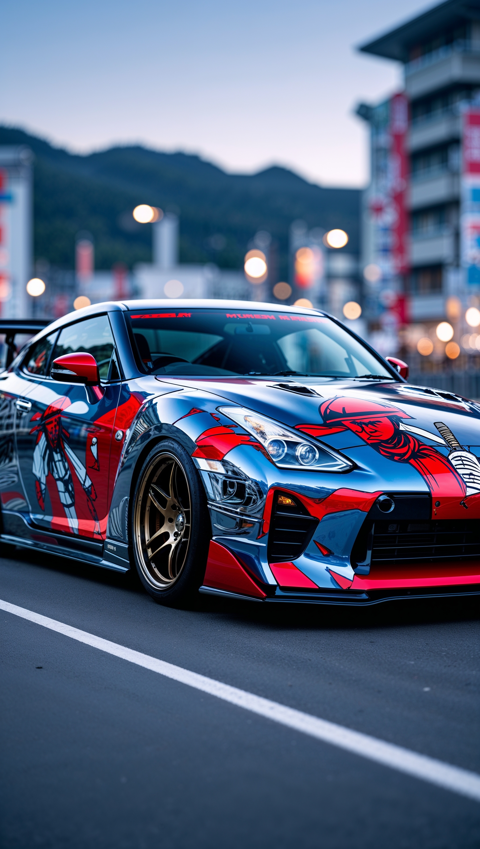 Matte red JDM car with Japanese design in background 1664x2944 Matte red JDM car with Japanese design in background