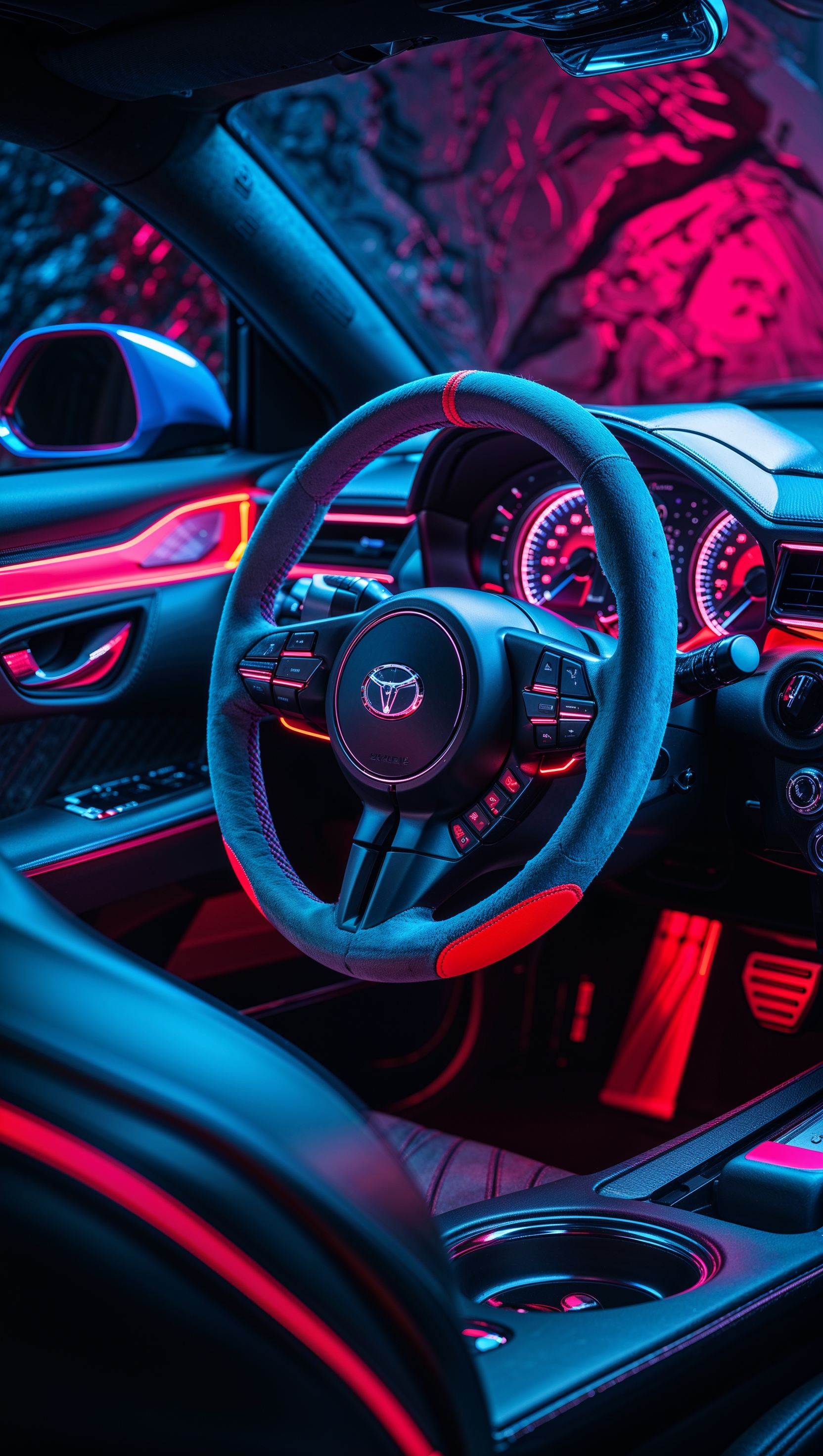 Interior view of a JDM car with sport steering wheel and neon light 1664x2944 Interior view of a JDM car with sport steering wheel and neon light