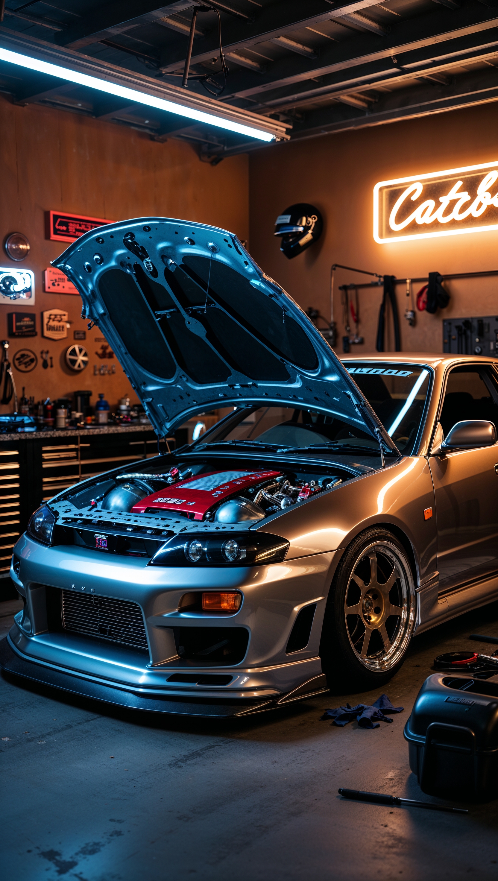 JDM car with open hood in a garage setting 1664x2944 JDM car with open hood in a garage setting