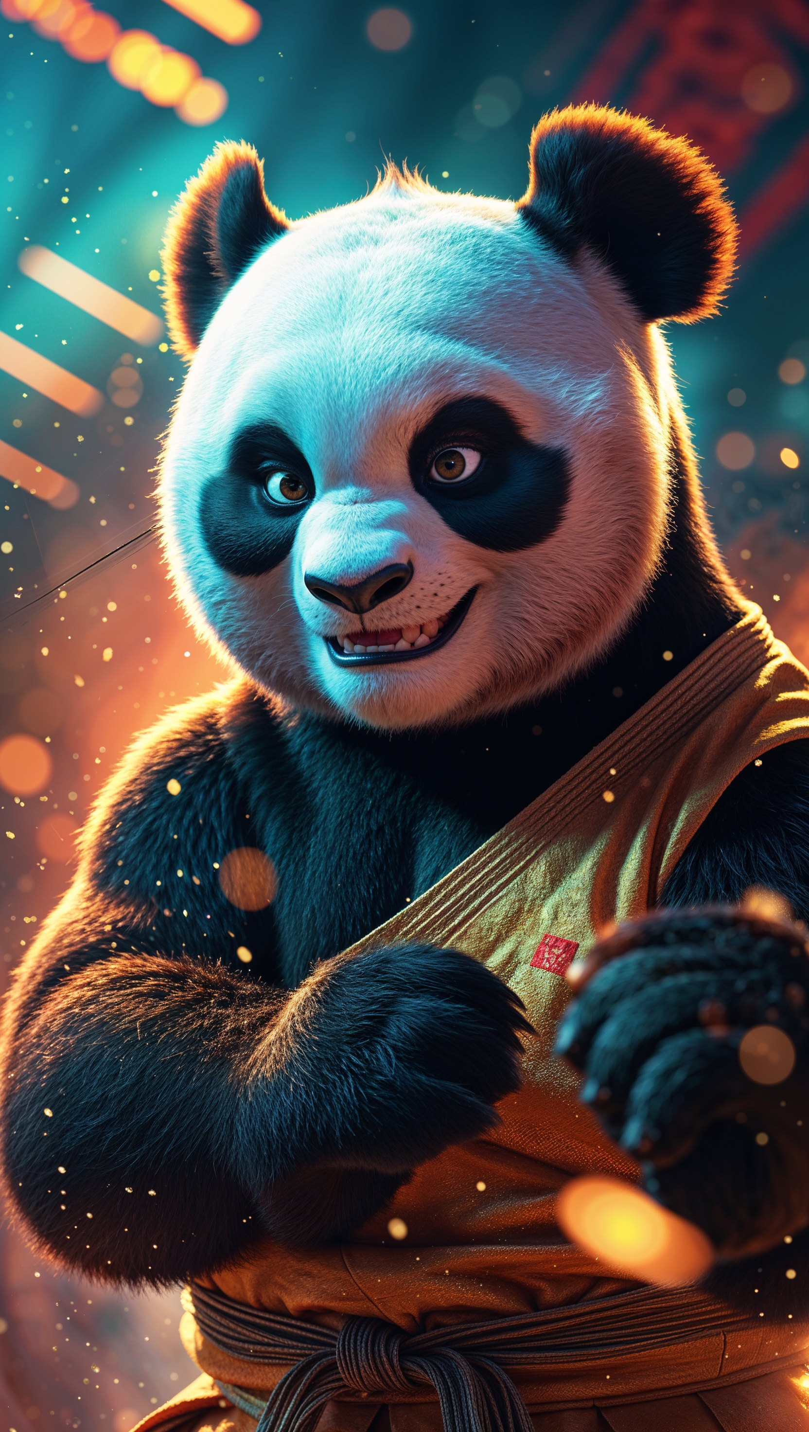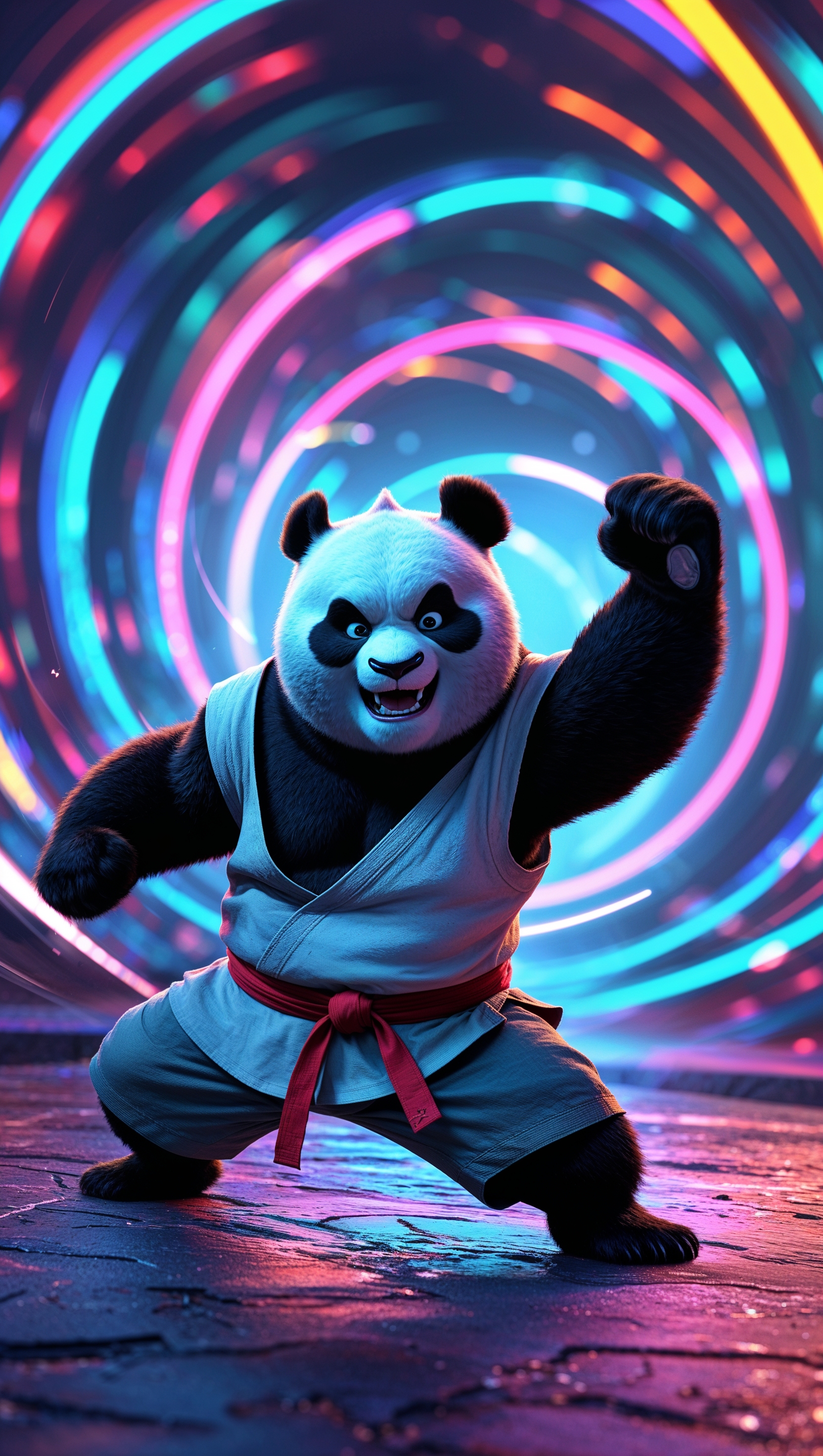 1664x2944 A digital artwork of Po performing a kung fu move with neon lights in the background