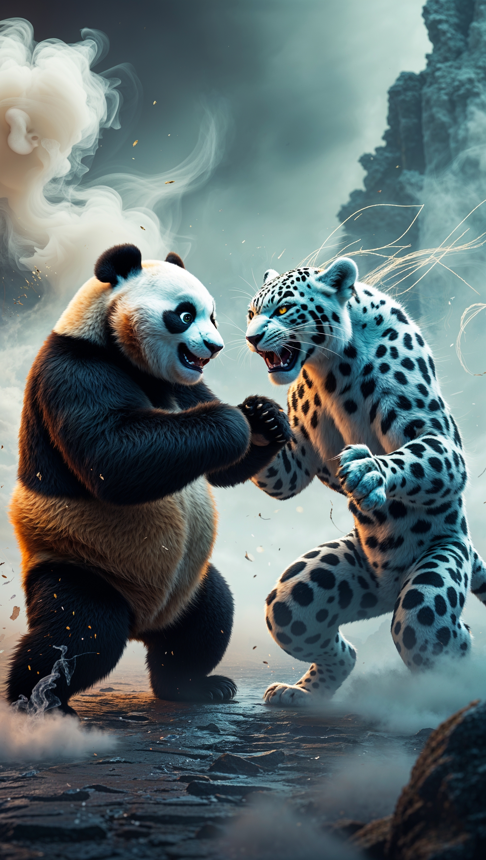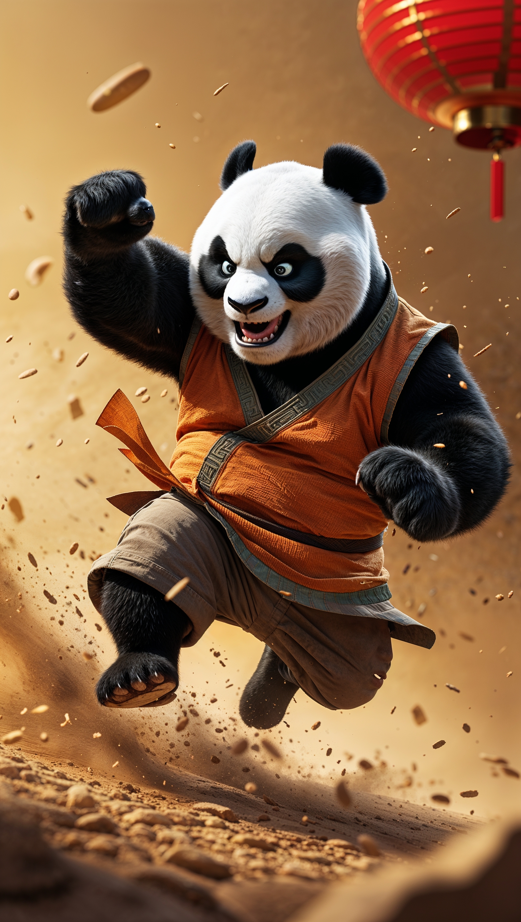 1664x2944 A dynamic scene of Po throwing a punch forward amid dust particles