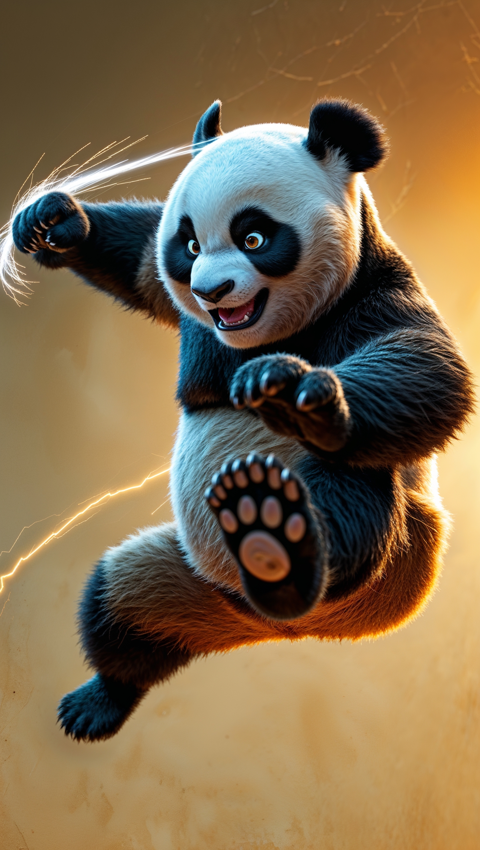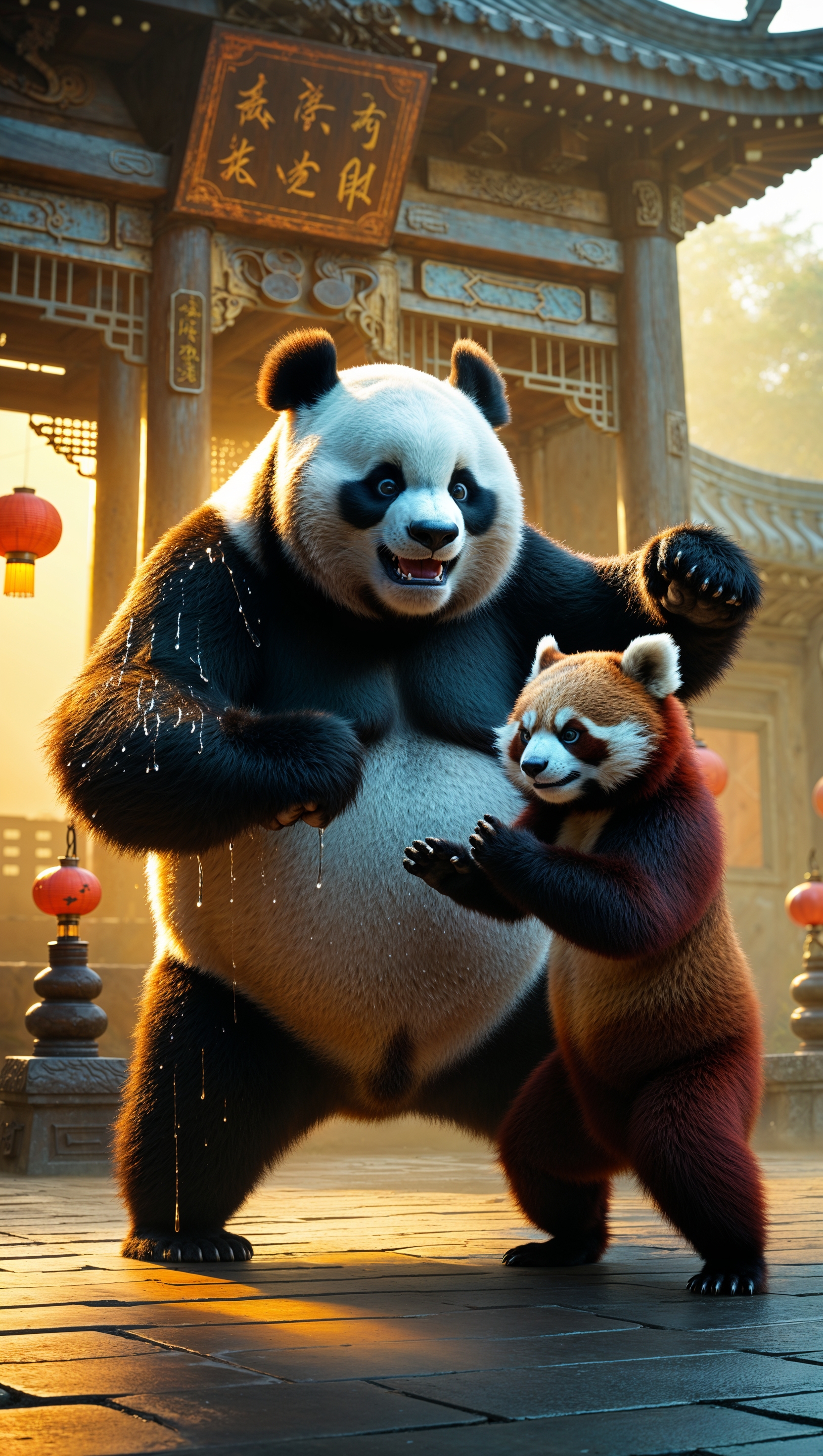 1664x2944 Po training kung fu with Master Shifu in a temple with golden light