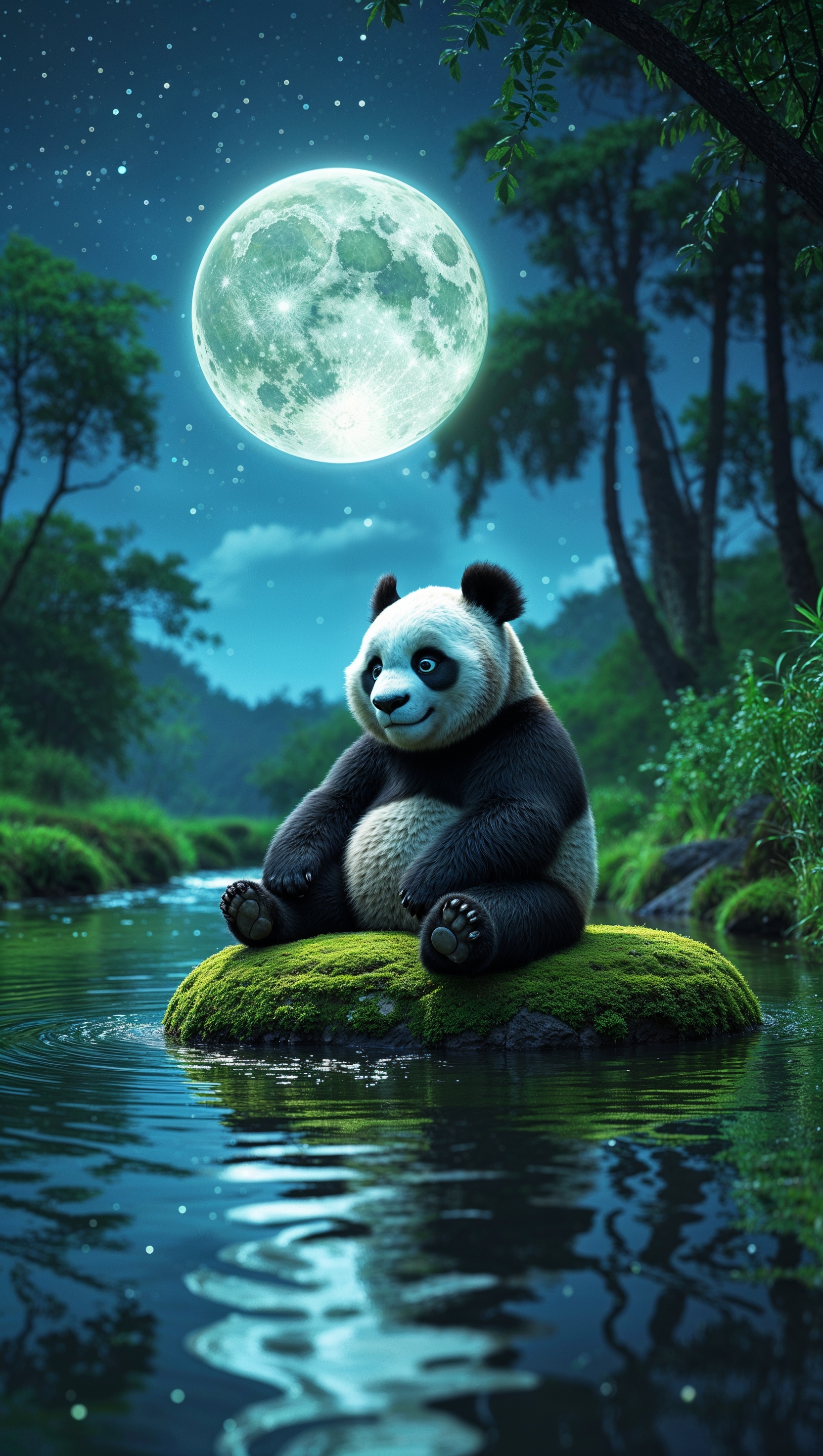 1664x2944 Po sitting on a rock by a river with the moon reflecting in the water