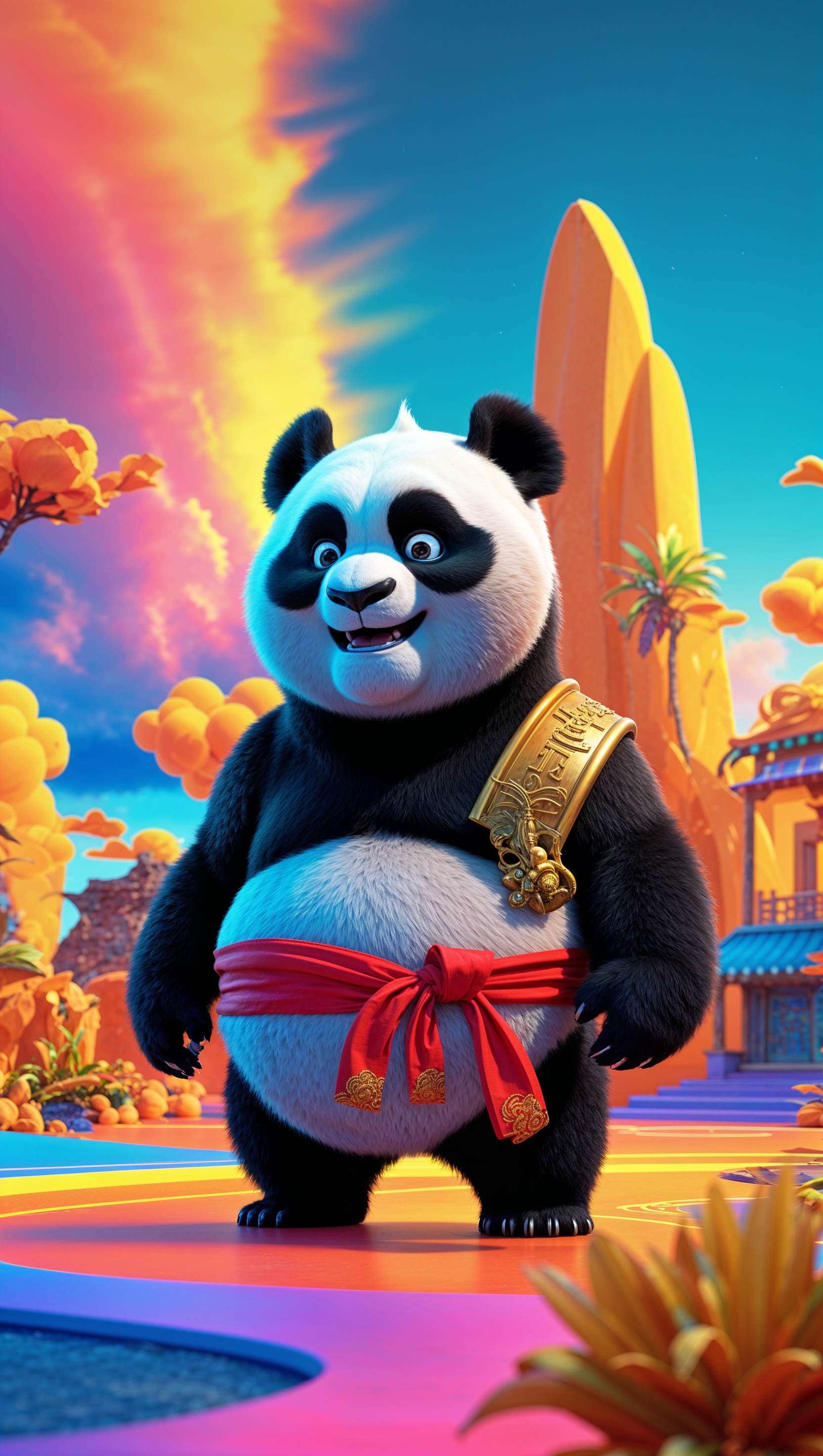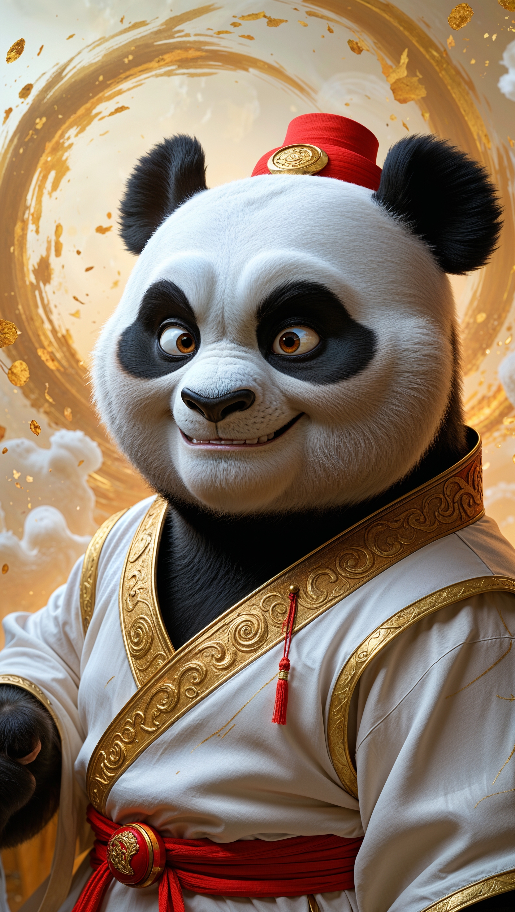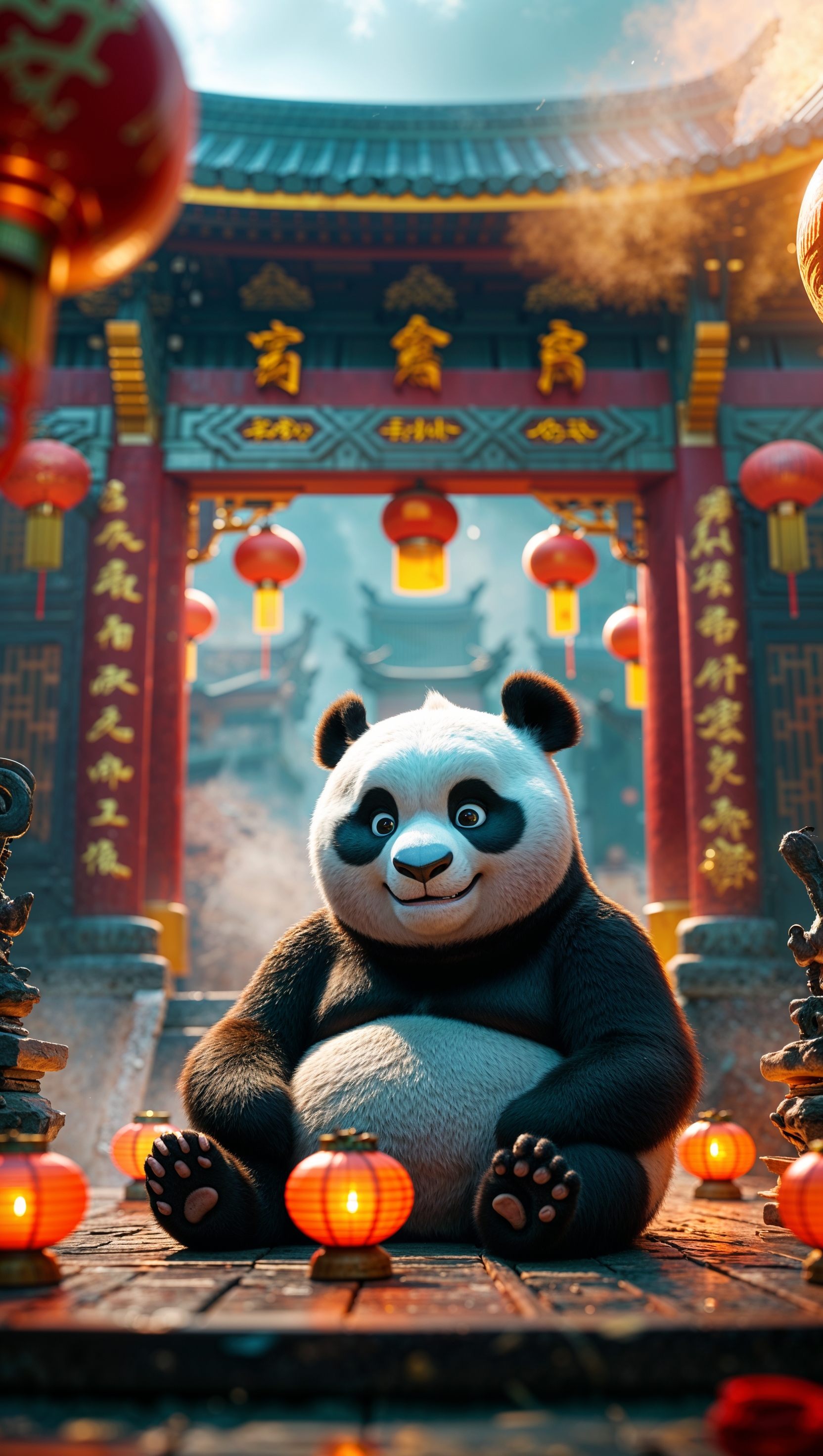 1664x2944 A 3D-rendered image of Po in a Chinese temple with golden details