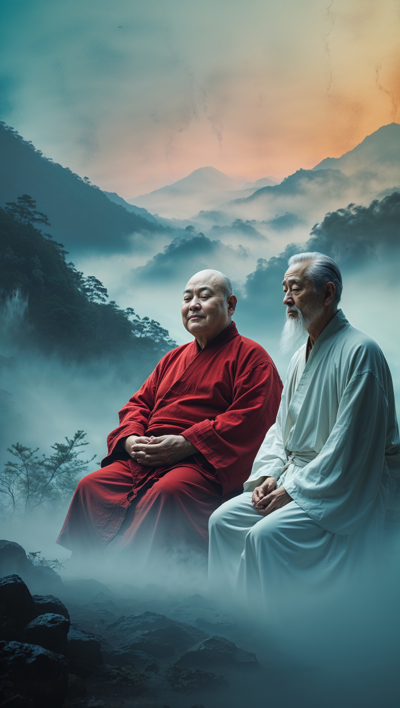 1664x2944 Po and Master Shifu meditating on a misty mountain
