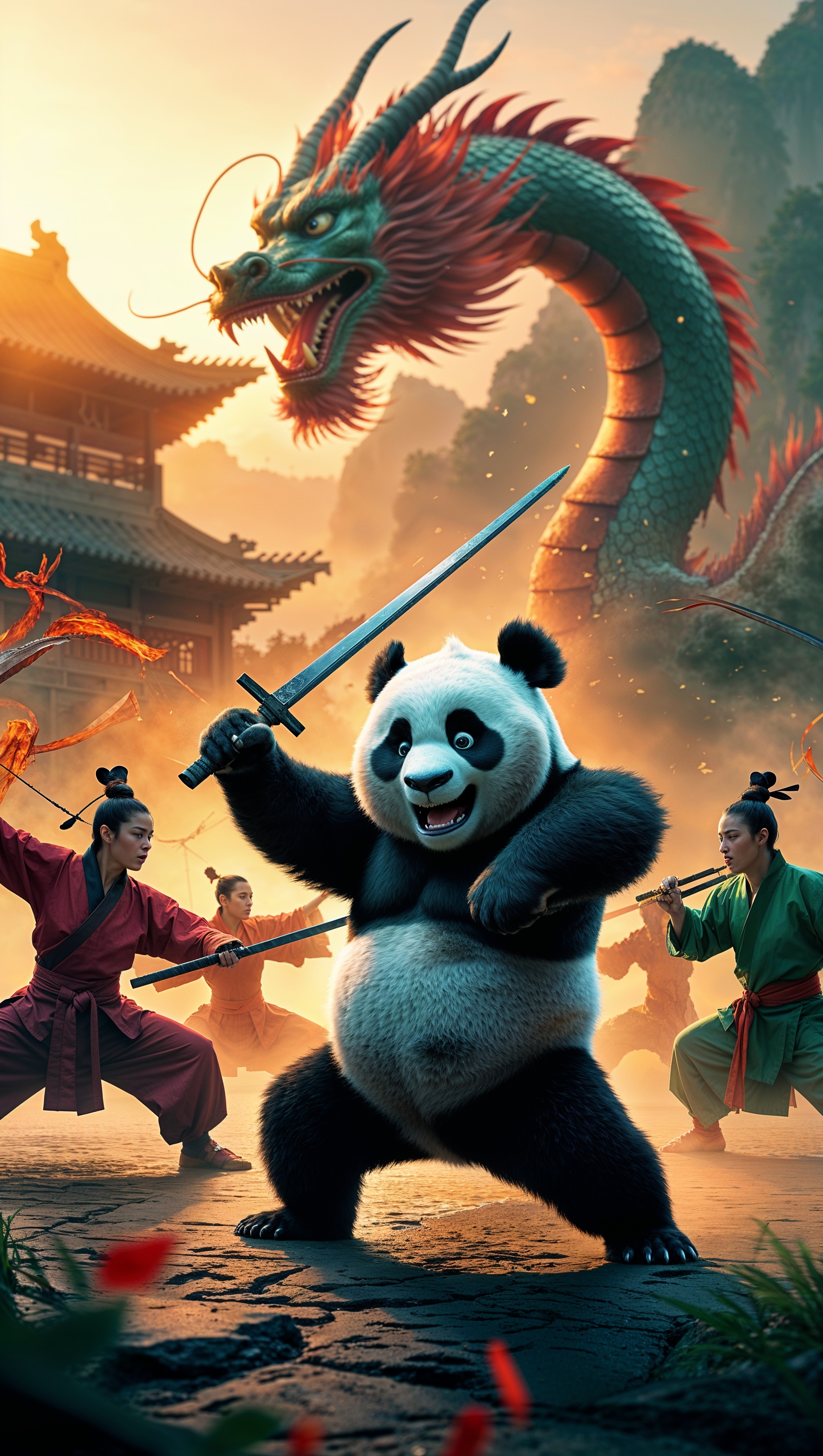 1664x2944 Po and the Furious Five fighting in a Chinese battlefield with a dragon in the background